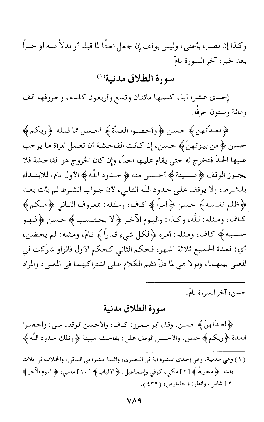 سورة الطلاق مدنية لِعِدَّتِهِنَّ حسن. وقال أبو عمرو: كاف، والأحسن الوقف على: وأحصوا العدّة رَبَّكُمْ حسن، والأحسن الوقف على: بفاحشة مبينة وَتِلْكَ حُدُودُ اللَّهِ