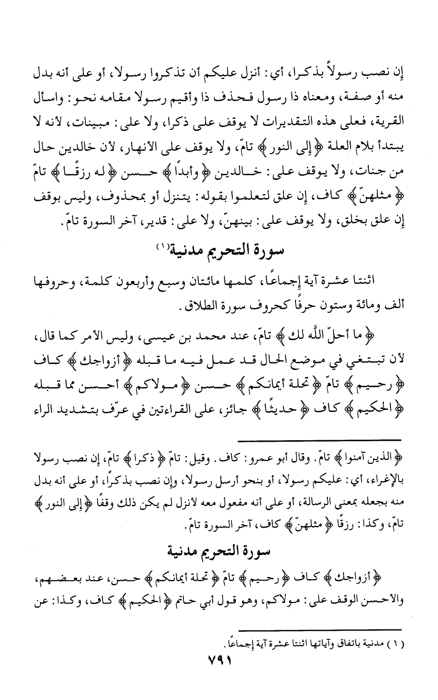سورة التحريم مدنية أَزْواجِكَ كاف رَحِيمٌ تامّ تَحِلَّةَ أَيْمانِكُمْ حسن، عند بعضهم، والأحسن الوقف على: مولاكم، وهو قول أبي حاتم الْحَكِيمُ كاف، وكذا: عن