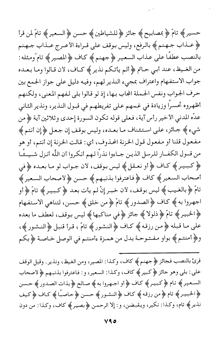 قرئ بالنصب فجائز جَهَنَّمَ كاف، وكذا: المصير، ومن الغيظ، ونذير. وقيل الوقف على: بلى وهو جائز كَبِيرٍ كاف، وكذا: السعير، و: فاعترفوا بذنبهم لِأَصْحابِ السَّعِيرِ تام كَبِيرٌ كاف أَوِ اجْهَرُوا بِهِ صالح بِذاتِ الصُّدُورِ حسن الْخَبِيرُ تام مِنْ رِزْقِهِ كاف النُّشُورُ حسن حاصِباً كاف كَيْفَ نَذِيرِ تام، وكذا: نكير، ويقبضن، و: إلا الرحمن بَصِيرٌ كاف، وكذا: من دون