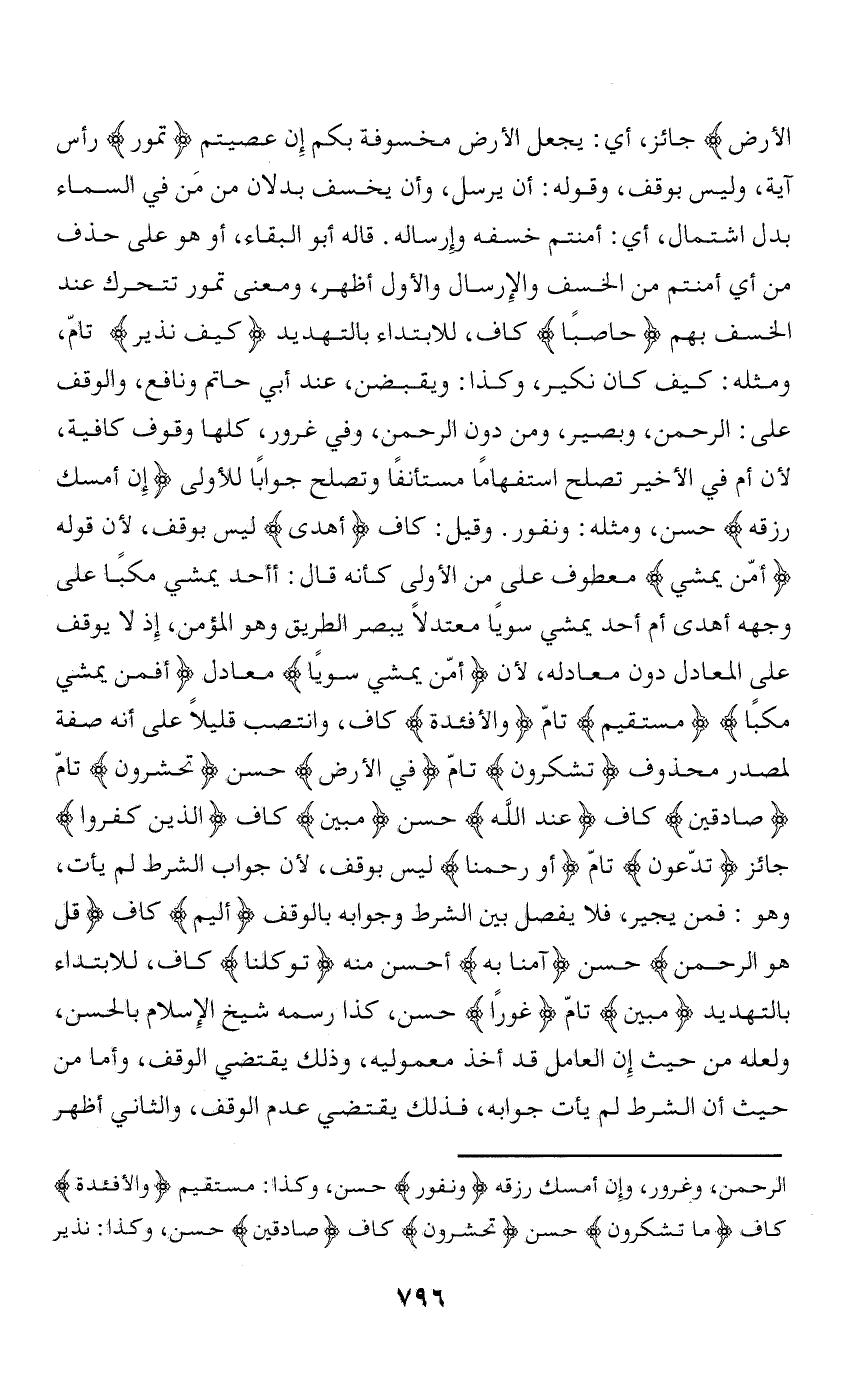 الْأَرْضَ جائز، أي: يجعل الأرض مخسوفة بكم إن عصيتم تَمُورُ رأس آية، وليس بوقف، وقوله: أن يرسل، وأن يخسف بدلان من من في السماء بدل اشتمال، أي: أمنتم خسفه وإرساله. قاله أبو البقاء، أو هو على حذف من أي أمنتم من الخسف والإرسال والأول أظهر، ومعنى تمور تتحرك عند الخسف بهم حاصِباً كاف، للابتداء بالتهديد كَيْفَ نَذِيرِ تامّ، ومثله: كيف كان نكير، وكذا: ويقبضن، عند أبي حاتم ونافع، والوقف على: الرحمن، وبصير، ومن دون الرحمن، وفي غرور، كلها وقوف كافية، لأن أم في الأخير تصلح استفهاما مستأنفا وتصلح جوابا للأولى إِنْ أَمْسَكَ رِزْقَهُ حسن، ومثله: ونفور. وقيل: كاف أَهْدى ليس بوقف، لأن قوله أَمَّنْ يَمْشِي معطوف على من الأولى كأنه قال: أأحد يمشي مكبا على وجهه أهدى أم أحد يمشي سويا معتدلا يبصر الطريق وهو المؤمن، إذ لا يوقف على المعادل دون معادله، لأن أَمَّنْ يَمْشِي سَوِيًّا معادل أَفَمَنْ يَمْشِي مُكِبًّا مُسْتَقِيمٍ تامّ وَالْأَفْئِدَةَ كاف، وانتصب قليلا على أنه صفة لمصدر محذوف تَشْكُرُونَ تامّ فِي الْأَرْضِ حسن تُحْشَرُونَ تامّ صادِقِينَ كاف عِنْدَ اللَّهِ حسن مُبِينٌ كاف الَّذِينَ كَفَرُوا جائز تَدَّعُونَ تامّ أَوْ رَحِمَنا ليس بوقف، لأن جواب الشرط لم يأت، وهو: فمن يجير، فلا يفصل بين الشرط وجوابه بالوقف أَلِيمٍ كاف قُلْ هُوَ الرَّحْمنُ حسن آمَنَّا بِهِ أحسن منه تَوَكَّلْنا كاف، للابتداء بالتهديد مُبِينٍ تامّ غَوْراً حسن، كذا رسمه شيخ الإسلام بالحسن، ولعله من حيث إن العامل قد أخذ معموليه، وذلك يقتضي الوقف، وأما من حيث أن الشرط لم يأت جوابه، فذلك يقتضي عدم الوقف، والثاني أظهر