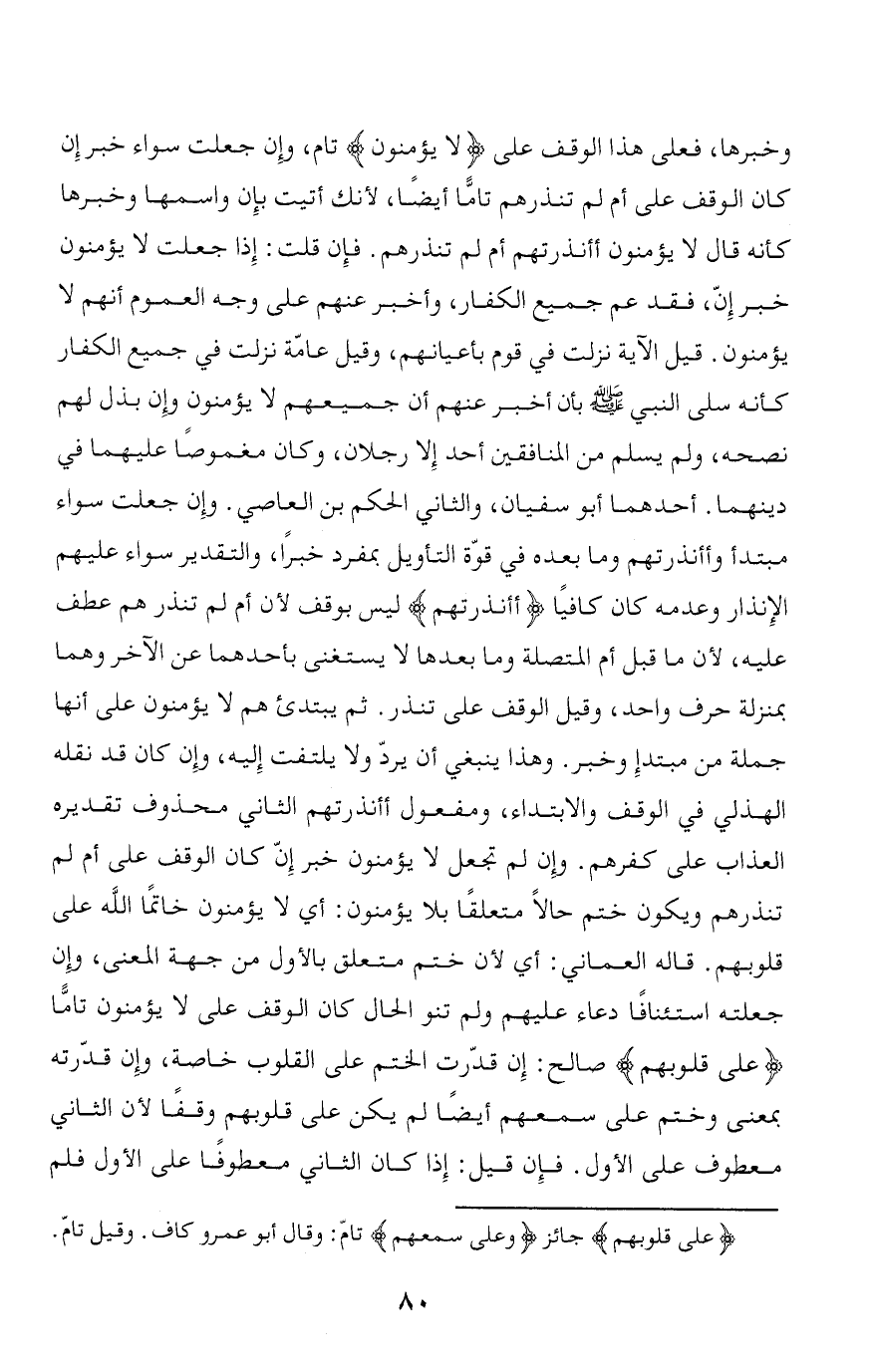 الإنذار وعدمه كان كافيا أَأَنْذَرْتَهُمْ ليس بوقف لأن أم لم تنذرهم عطف عليه، لأن ما قبل أم المتصلة وما بعدها لا يستغنى بأحدهما عن الآخر وهما بمنزلة حرف واحد، وقيل الوقف على تنذر. ثم يبتدئ هم لا يؤمنون على أنها جملة من مبتدإ وخبر. وهذا ينبغي أن يردّ ولا يلتفت إليه، وإن كان قد نقله الهذلي في الوقف والابتداء، ومفعول أأنذرتهم الثاني محذوف تقديره العذاب على كفرهم. وإن لم تجعل لا يؤمنون خبر إنّ كان الوقف على أم لم تنذرهم ويكون ختم حالا متعلقا بلا يؤمنون: أي لا يؤمنون خاتما الله على قلوبهم. قاله العماني: أي لأن ختم متعلق بالأول من جهة المعنى، وإن جعلته استئنافا دعاء عليهم ولم تنو الحال كان الوقف على لا يؤمنون تامّا عَلى قُلُوبِهِمْ صالح: إن قدّرت الختم على القلوب خاصة، وإن قدّرته بمعنى وختم على سمعهم أيضا لم يكن على قلوبهم وقفا لأن الثاني معطوف على الأول. فإن قيل: إذا كان الثاني معطوفا على الأول فلم