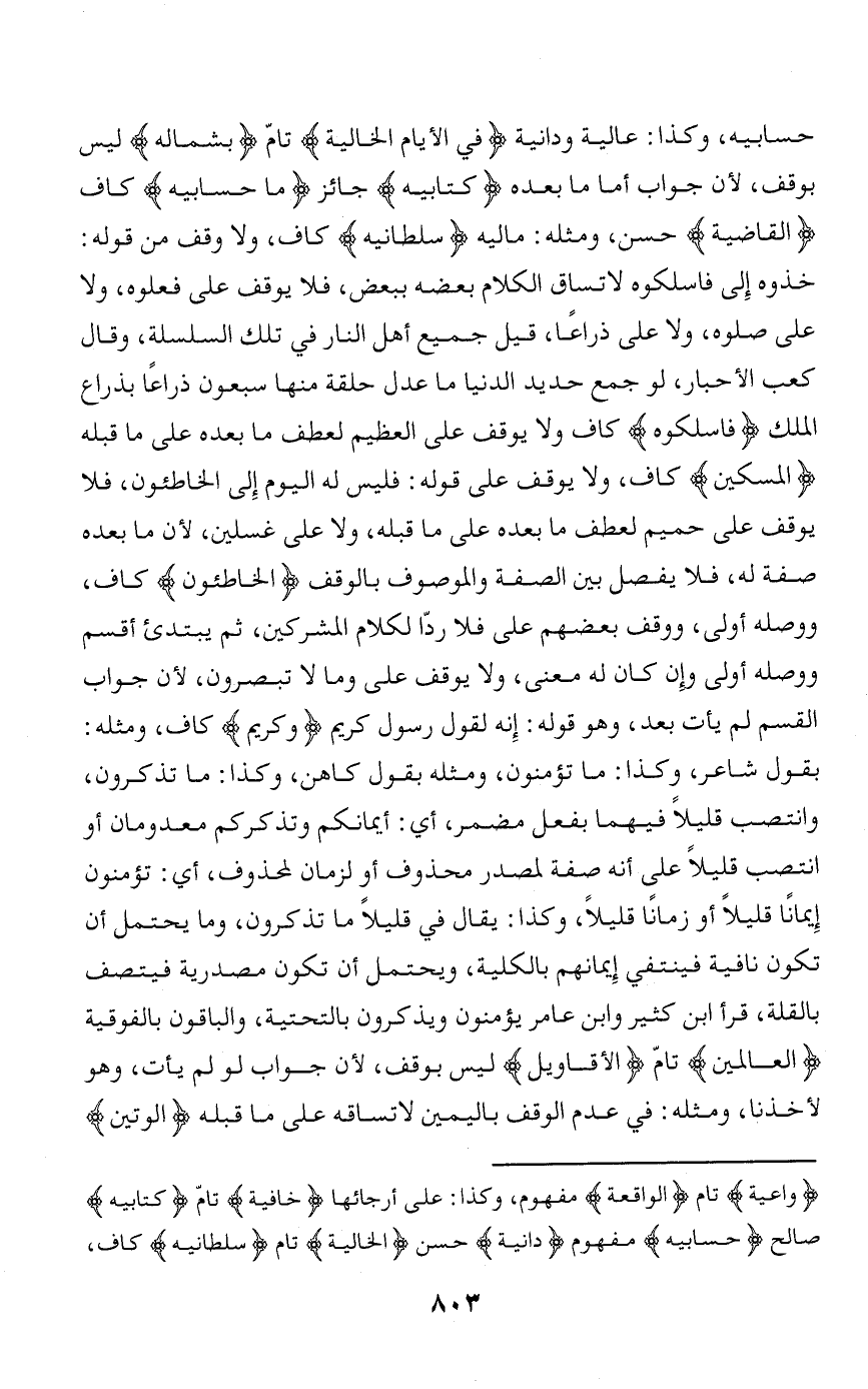 حسابيه، وكذا: عالية ودانية فِي الْأَيَّامِ الْخالِيَةِ تامّ بِشِمالِهِ ليس بوقف، لأن جواب أما ما بعده كِتابِيَهْ جائز ما حِسابِيَهْ كاف الْقاضِيَةَ حسن، ومثله: ماليه سُلْطانِيَهْ كاف، ولا وقف من قوله: