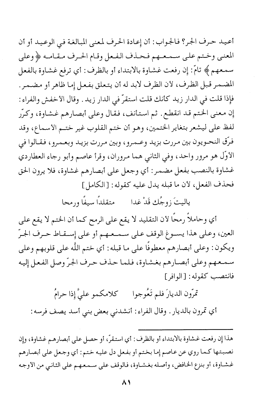 أي وحاملا رمحا لأن التقليد لا يقع على الرمح كما أن الختم لا يقع على العين، وعلى هذا يسوغ الوقف على سمعهم أو على إسقاط حرف الجرّ ويكون: وعلى أبصارهم معطوفا على ما قبله: أي ختم الله على قلوبهم وعلى سمعهم وعلى أبصارهم بغشاوة، فلما حذف حرف الجرّ وصل الفعل إليه فانتصب كقوله: [الوافر]