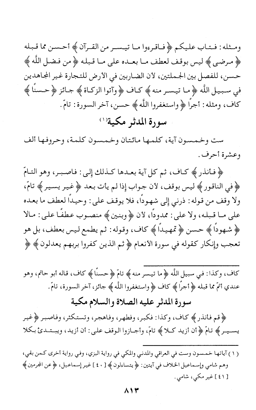 سورة المدثر عليه الصلاة والسلام مكية قُمْ فَأَنْذِرْ كاف، وكذا: فكبر، وفطهر، وفاهجر، وتستكثر، وفاصبر غَيْرُ يَسِيرٍ تامّ أَنْ أَزِيدَ كَلَّا تامّ، وأجازوا الوقف على: أن أزيد، ويبتدئ بكلا