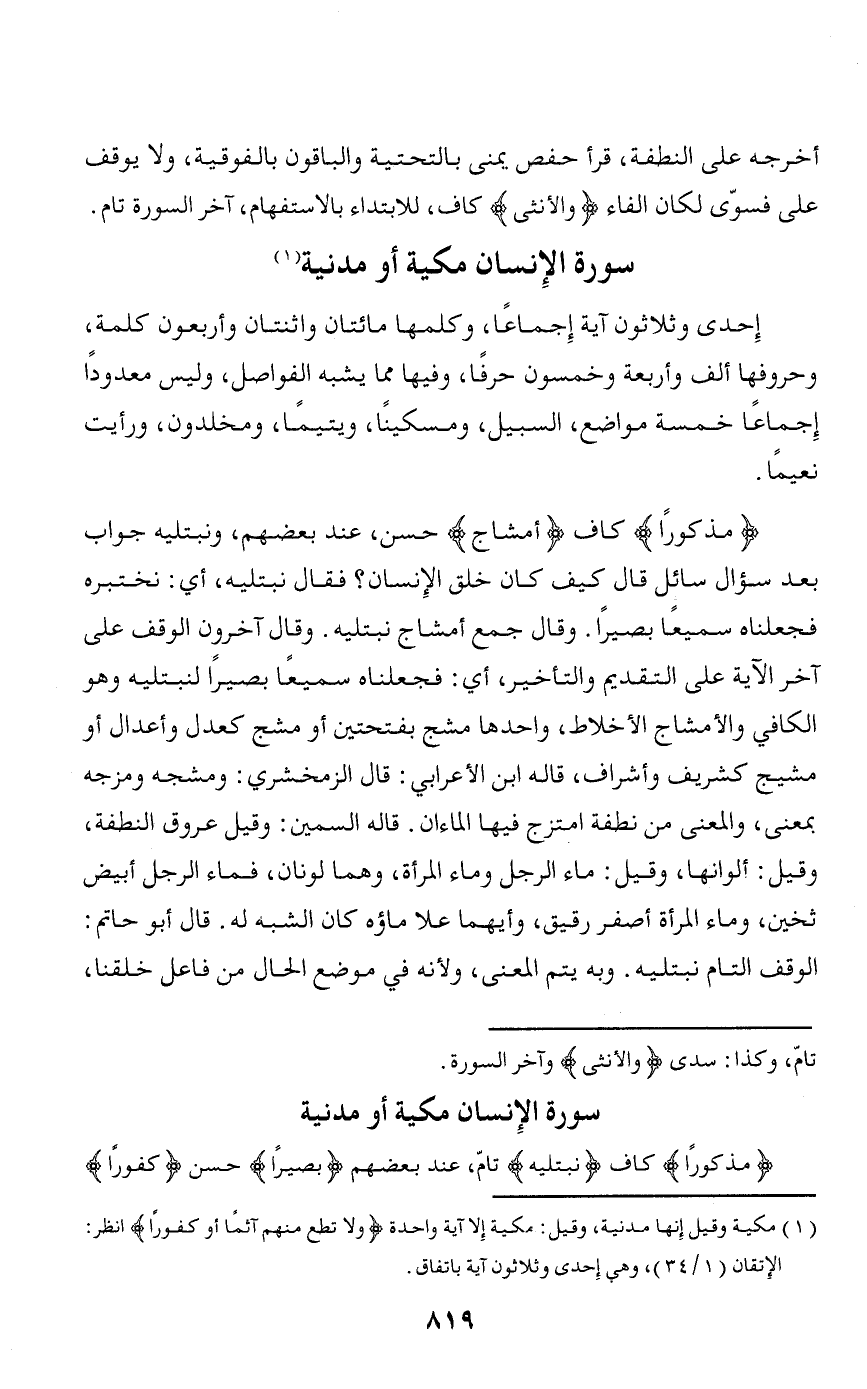 سورة الإنسان مكية أو مدنية مَذْكُوراً كاف نَبْتَلِيهِ تامّ، عند بعضهم بَصِيراً حسن كَفُوراً