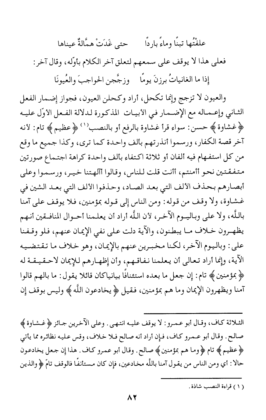 والعيون لا تزجج وإنما تكحل، أراد وكحلن العيون، فجواز إضمار الفعل الثاني وإعماله مع الإضمار في الأبيات المذكورة لدلالة الفعل الأوّل عليه غِشاوَةٌ حسن: سواء قرأ غشاوة بالرفع أو بالنصب (¬1) عَظِيمٌ تام: لأنه آخر قصة الكفار، ورسموا أنذرتهم بألف واحدة كما ترى، وكذا جميع ما وقع من كل استفهام فيه ألفان أو ثلاثة اكتفاء بألف واحدة كراهة اجتماع صورتين متفقتين نحو أأمنتم، أأنت قلت للناس، وقالوا أآلهتنا خير، ورسموا وعلى أبصارهم بحذف الألف التي بعد الصاد، وحذفوا الألف التي بعد الشين في غشاوة، ولا وقف من قوله: ومن الناس إلى قوله بمؤمنين، فلا يوقف على آمنا بالله، ولا على وباليوم الآخر، لأن الله أراد أن يعلمنا أحوال المنافقين أنهم يظهرون خلاف ما يبطنون، والآية دلت على نفي الإيمان عنهم، فلو وقفنا على: وباليوم الآخر، لكنا مخبرين عنهم بالإيمان، وهو خلاف ما تقتضيه الآية، وإنما أراد تعالى أن يعلمنا نفاقهم، وأن إظهارهم للإيمان لا حقيقة له بِمُؤْمِنِينَ تام: إن جعل ما بعده استئنافا بيانيا كأن قائلا يقول: ما بالهم قالوا آمنا ويظهرون الإيمان وما هم بمؤمنين، فقيل يُخادِعُونَ اللَّهَ وليس بوقف إن