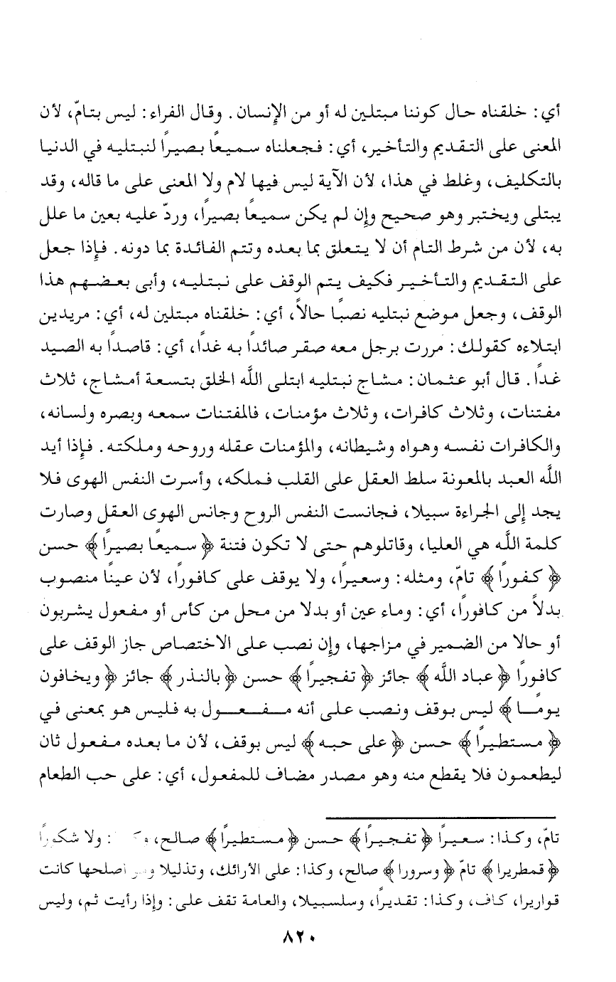 أي: خلقناه حال كوننا مبتلين له أو من الإنسان. وقال الفراء: ليس بتامّ، لأن المعنى على التقديم والتأخير، أي: فجعلناه سميعا بصيرا لنبتليه في الدنيا بالتكليف، وغلط في هذا، لأن الآية ليس فيها لام ولا المعنى على ما قاله، وقد يبتلى ويختبر وهو صحيح وإن لم يكن سميعا بصيرا، وردّ عليه بعين ما علل به، لأن من شرط التام أن لا يتعلق بما بعده وتتم الفائدة بما دونه. فإذا جعل على التقديم والتأخير فكيف يتم الوقف على نبتليه، وأبى بعضهم هذا الوقف، وجعل موضع نبتليه نصبا حالا، أي: خلقناه مبتلين له، أي: مريدين ابتلاءه كقولك: مررت برجل معه صقر صائدا به غدا، أي: قاصدا به الصيد غدا. قال أبو عثمان: أمشاج نبتليه ابتلى الله الخلق بتسعة أمشاج، ثلاث مفتنات، وثلاث كافرات، وثلاث مؤمنات، فالمفتنات سمعه وبصره ولسانه، والكافرات نفسه وهواه وشيطانه، والمؤمنات عقله وروحه وملكته. فإذا أيد الله العبد بالمعونة سلط العقل على القلب فملكه، وأسرت النفس الهوى فلا يجد إلى الجراءة سبيلا، فجانست النفس الروح وجانس الهوى العقل وصارت كلمة الله هي العليا، وقاتلوهم حتى لا تكون فتنة سَمِيعاً بَصِيراً حسن كَفُوراً تامّ، ومثله: وسعيرا، ولا يوقف على كافورا، لأن عينا منصوب بدلا من كافورا، أي: وماء عين أو بدلا من محل من كأس أو مفعول يشربون أو حالا من الضمير في مزاجها، وإن نصب على الاختصاص جاز الوقف على كافورا عِبادُ اللَّهِ جائز تَفْجِيراً حسن بِالنَّذْرِ جائز وَيَخافُونَ يَوْماً ليس بوقف ونصب على أنه مفعول به فليس هو بمعنى في مُسْتَطِيراً حسن عَلى حُبِّهِ ليس بوقف، لأن ما بعده مفعول ثان ليطعمون فلا يقطع منه وهو مصدر مضاف للمفعول، أي: على حب الطعام