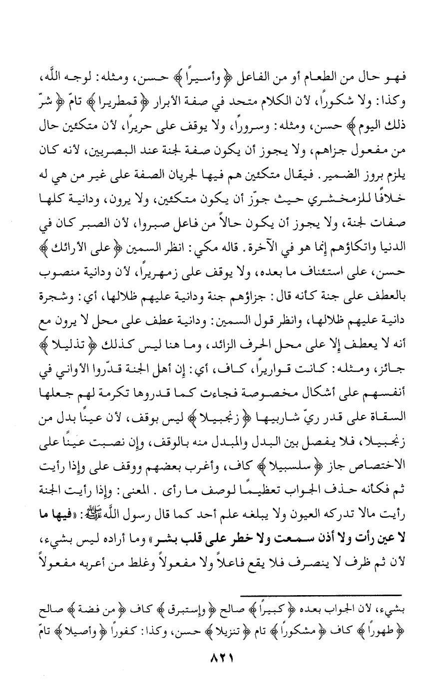 فهو حال من الطعام أو من الفاعل وَأَسِيراً حسن، ومثله: لوجه الله، وكذا: ولا شكورا، لأن الكلام متحد في صفة الأبرار قَمْطَرِيراً تامّ شَرَّ ذلِكَ الْيَوْمِ حسن، ومثله: وسرورا، ولا يوقف على حريرا، لأن متكئين حال من مفعول جزاهم، ولا يجوز أن يكون صفة لجنة عند البصريين، لأنه كان يلزم بروز الضمير. فيقال متكئين هم فيها لجريان الصفة على غير من هي له خلافا للزمخشري حيث جوّز أن يكون متكئين، ولا يرون، ودانية كلها صفات لجنة، ولا يجوز أن يكون حالا من فاعل صبروا، لأن الصبر كان في الدنيا واتكاؤهم إنما هو في الآخرة. قاله مكي: انظر السمين عَلَى الْأَرائِكِ حسن، على استئناف ما بعده، ولا يوقف على زمهريرا، لأن ودانية منصوب بالعطف على جنة كأنه قال: جزاؤهم جنة ودانية عليهم ظلالها، أي: وشجرة دانية عليهم ظلالها، وانظر قول السمين: ودانية عطف على محل لا يرون مع أنه لا يعطف إلا على محل الحرف الزائد، وما هنا ليس كذلك تَذْلِيلًا جائز، ومثله: كانت قواريرا، كاف، أي: إن أهل الجنة قدّروا الأواني في أنفسهم على أشكال مخصوصة فجاءت كما قدروها تكرمة لهم جعلها السقاة على قدر ريّ شاربيها زَنْجَبِيلًا ليس بوقف، لأن عينا بدل من زنجبيلا، فلا يفصل بين البدل والمبدل منه بالوقف، وإن نصبت عينا على الاختصاص جاز سَلْسَبِيلًا كاف، وأغرب بعضهم ووقف على وإذا رأيت ثم فكأنه حذف الجواب تعظيما لوصف ما رأى. المعنى: وإذا رأيت الجنة رأيت ما لا تدركه العيون ولا يبلغه علم أحد كما قال رسول الله صلّى الله عليه وسلّم: «فيها ما لا عين رأت ولا أذن سمعت ولا خطر على قلب بشر» وما أراده ليس بشيء، لأن ثم ظرف لا ينصرف فلا يقع فاعلا ولا مفعولا وغلط من أعربه مفعولا