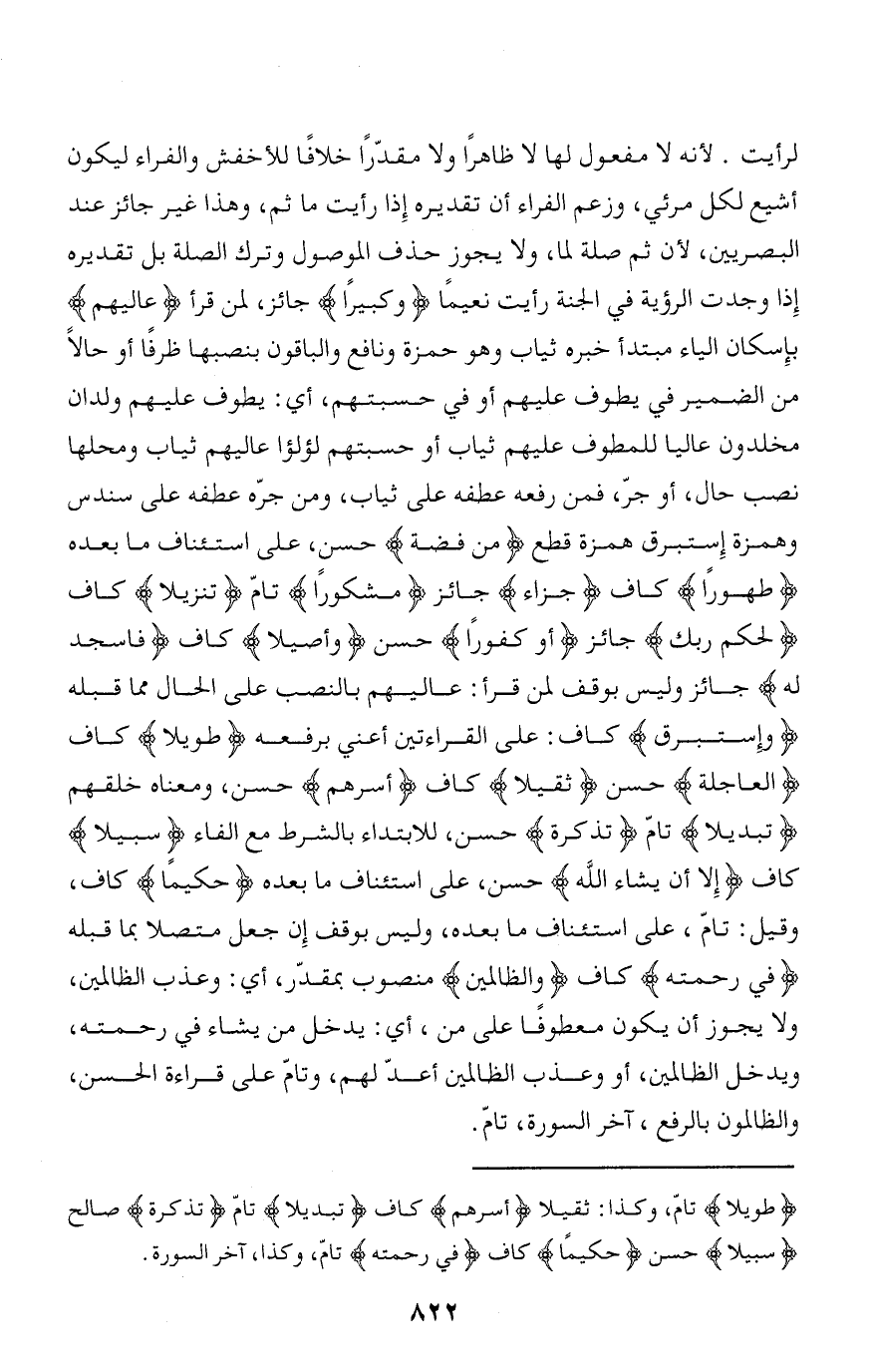 لرأيت. لأنه لا مفعول لها لا ظاهرا ولا مقدّرا خلافا للأخفش والفراء ليكون أشيع لكل مرئي، وزعم الفراء أن تقديره إذا رأيت ما ثم، وهذا غير جائز عند البصريين، لأن ثم صلة لما، ولا يجوز حذف الموصول وترك الصلة بل تقديره إذا وجدت الرؤية في الجنة رأيت نعيما وكَبِيراً جائز، لمن قرأ عالِيَهُمْ بإسكان الياء مبتدأ خبره ثياب وهو حمزة ونافع والباقون بنصبها ظرفا أو حالا من الضمير في يطوف عليهم أو في حسبتهم، أي: يطوف عليهم ولدان مخلدون عاليا للمطوف عليهم ثياب أو حسبتهم لؤلؤا عاليهم ثياب ومحلها نصب حال، أو جرّ، فمن رفعه عطفه على ثياب، ومن جرّه عطفه على سندس وهمزة إستبرق همزة قطع مِنْ فِضَّةٍ حسن، على استئناف ما بعده طَهُوراً كاف جَزاءً جائز مَشْكُوراً تامّ تَنْزِيلًا كاف لِحُكْمِ رَبِّكَ جائز أَوْ كَفُوراً حسن وَأَصِيلًا كاف فَاسْجُدْ لَهُ جائز وليس بوقف لمن قرأ: عاليهم بالنصب على الحال مما قبله وَإِسْتَبْرَقٌ كاف: على القراءتين أعني برفعه طَوِيلًا كاف الْعاجِلَةَ حسن ثَقِيلًا كاف أَسْرَهُمْ حسن، ومعناه خلقهم تَبْدِيلًا تامّ تَذْكِرَةٌ حسن، للابتداء بالشرط مع الفاء سَبِيلًا كاف إِلَّا أَنْ يَشاءَ اللَّهُ حسن، على استئناف ما بعده حَكِيماً كاف، وقيل: تامّ، على استئناف ما بعده، وليس بوقف إن جعل متصلا بما قبله فِي رَحْمَتِهِ كاف وَالظَّالِمِينَ منصوب بمقدّر، أي: وعذب الظالمين، ولا يجوز أن يكون معطوفا على من، أي: يدخل من يشاء في رحمته، ويدخل الظالمين، أو وعذب الظالمين أعدّ لهم، وتامّ على قراءة الحسن، والظالمون بالرفع، آخر السورة، تامّ.
