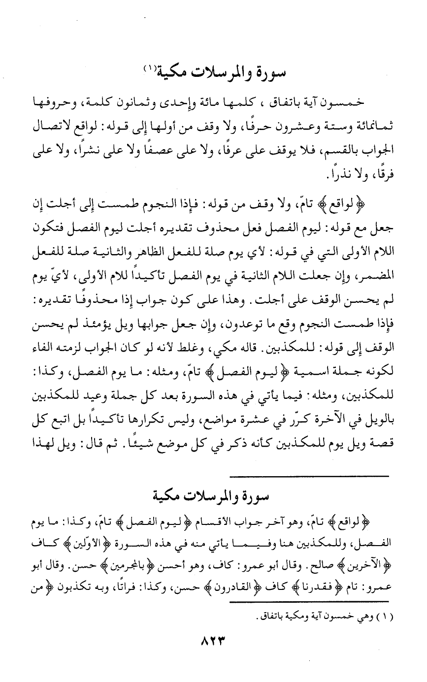 سورة والمرسلات مكية لَواقِعٌ تامّ، وهو آخر جواب الأقسام لِيَوْمِ الْفَصْلِ تامّ، وكذا: ما يوم الفصل، وللمكذبين هنا وفيما يأتي منه في هذه السورة الْأَوَّلِينَ كاف الْآخِرِينَ صالح. وقال أبو عمرو: كاف، وهو أحسن بِالْمُجْرِمِينَ حسن. وقال أبو عمرو: تام فَقَدَرْنا كاف الْقادِرُونَ حسن، وكذا: فراتا، وبه تكذبون مِنَ