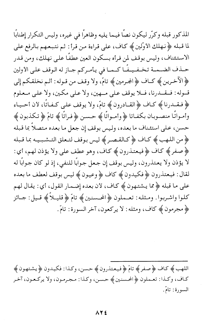 المذكور قبله وكرّر ليكون نصا فيما يليه وظاهرا في غيره، وليس التكرار إطنابا لما قبله نُهْلِكِ الْأَوَّلِينَ كاف، على قراءة من قرأ: ثم نتبعهم بالرفع على الاستئناف، وليس بوقف لمن قرأه بسكون العين عطفا على نهلك، ومن قدر حذف الضمة تخفيفا كما في يأمركم جاز له الوقف على الأولين الْآخِرِينَ كاف بِالْمُجْرِمِينَ تامّ، ولا وقف من قوله: ألم نخلقكم إلى قوله: فقدرنا، فلا يوقف على مهين، ولا على مكين، ولا على معلوم فَقَدَرْنا كاف الْقادِرُونَ تامّ، ولا يوقف على كفاتا، لأن أحياء وأمواتا منصوبان بكفاتا وَأَمْواتاً حسن فُراتاً تامّ تُكَذِّبُونَ حسن، على استئناف ما بعده، وليس بوقف إن جعل ما بعده متصلا بما قبله مِنَ اللَّهَبِ كاف كَالْقَصْرِ ليس بوقف لتعلق التشبيه بما قبله صُفْرٌ كاف فَيَعْتَذِرُونَ كاف، وهو عطف على ولا يؤذن لهم، أي: