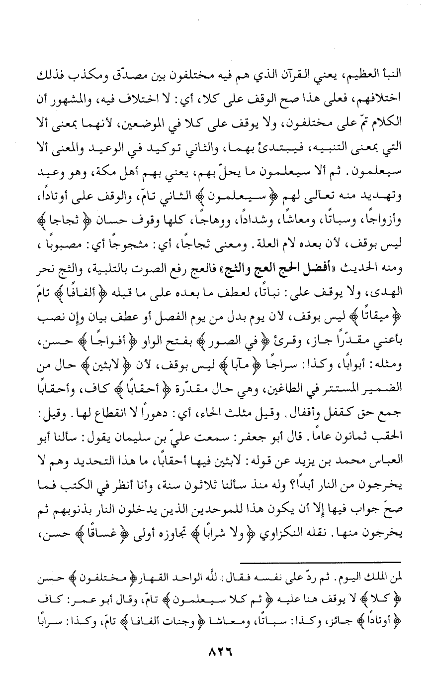 النبأ العظيم، يعني القرآن الذي هم فيه مختلفون بين مصدّق ومكذب فذلك اختلافهم، فعلى هذا صح الوقف على كلا، أي: لا اختلاف فيه، والمشهور أن الكلام تمّ على مختلفون، ولا يوقف على كلا في الموضعين، لأنهما بمعنى ألا التي بمعنى التنبيه، فيبتدئ بهما، والثاني توكيد في الوعيد والمعنى ألا سيعلمون. ثم ألا سيعلمون ما يحلّ بهم، يعني بهم أهل مكة، وهو وعيد وتهديد منه تعالى لهم سَيَعْلَمُونَ الثاني تامّ، والوقف على أوتادا، وأزواجا، وسباتا، ومعاشا، وشدادا، ووهاجا، كلها وقوف حسان ثَجَّاجاً ليس بوقف، لأن بعده لام العلة. ومعنى ثجاجا، أي: مثجوجا أي: مصبوبا، ومنه الحديث «أفضل الحج العج والثج» فالعج رفع الصوت بالتلبية، والثج نحر الهدى، ولا يوقف على: نباتا، لعطف ما بعده على ما قبله أَلْفافاً تامّ مِيقاتاً ليس بوقف، لأن يوم بدل من يوم الفصل أو عطف بيان وإن نصب بأعني مقدّرا جاز، وقرئ في الصور بفتح الواو أَفْواجاً حسن، ومثله: أبوابا، وكذا: سراجا مَآباً ليس بوقف، لأن لابِثِينَ حال من الضمير المستتر في الطاغين، وهي حال مقدّرة أَحْقاباً كاف، وأحقابا جمع حق كقفل وأقفال. وقيل مثلث الحاء، أي: دهورا لا انقطاع لها. وقيل:
