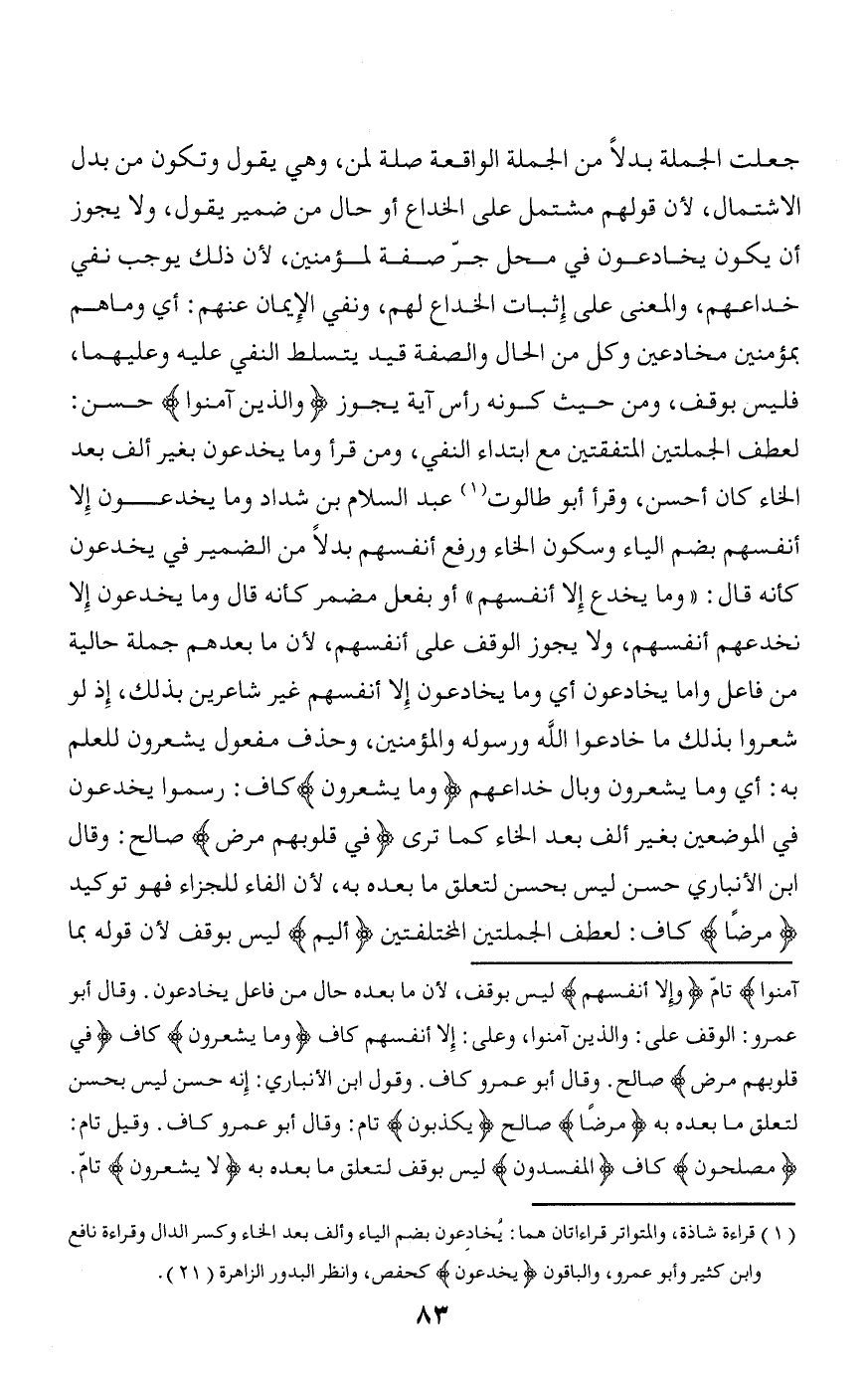 لعطف الجملتين المتفقتين مع ابتداء النفي، ومن قرأ وما يخدعون بغير ألف بعد الخاء كان أحسن، وقرأ أبو طالوت (¬1) عبد السلام بن شداد وما يخدعون إلا أنفسهم بضم الياء وسكون الخاء ورفع أنفسهم بدلا من الضمير في يخدعون كأنه قال: «وما يخدع إلا أنفسهم» أو بفعل مضمر كأنه قال وما يخدعون إلا نخدعهم أنفسهم، ولا يجوز الوقف على أنفسهم، لأن ما بعدهم جملة حالية من فاعل واما يخادعون أي وما يخادعون إلا أنفسهم غير شاعرين بذلك، إذ لو شعروا بذلك ما خادعوا الله ورسوله والمؤمنين، وحذف مفعول يشعرون للعلم به: أي وما يشعرون وبال خداعهم وَما يَشْعُرُونَ كاف: رسموا يخدعون في الموضعين بغير ألف بعد الخاء كما ترى فِي قُلُوبِهِمْ مَرَضٌ صالح: وقال ابن الأنباري حسن ليس بحسن لتعلق ما بعده به، لأن الفاء للجزاء فهو توكيد مَرَضاً كاف: لعطف الجملتين المختلفتين أَلِيمٌ ليس بوقف لأن قوله بما