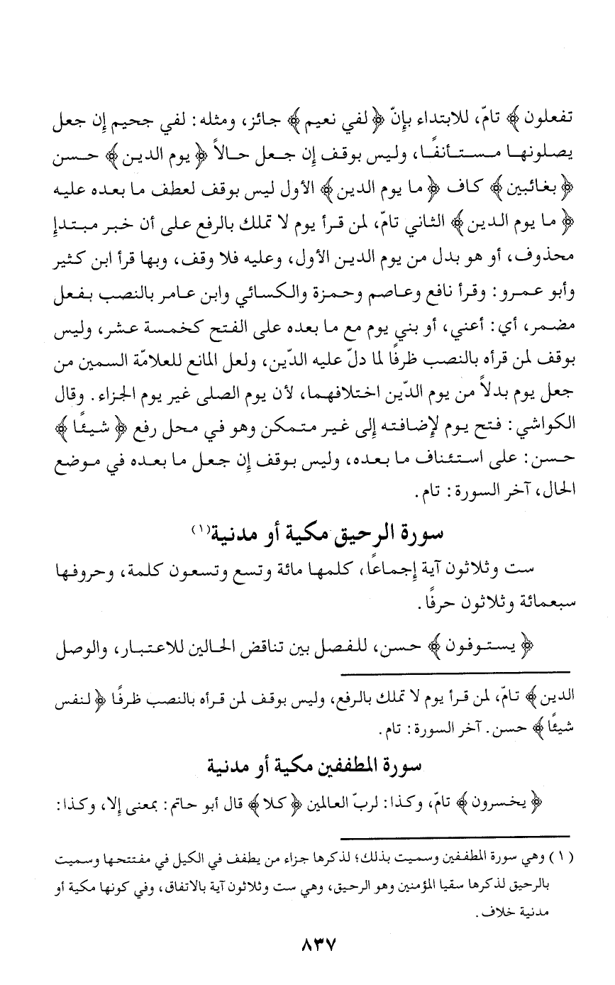 سورة المطففين مكية أو مدنية يُخْسِرُونَ تامّ، وكذا: لربّ العالمين كَلَّا قال أبو حاتم: بمعنى إلا، وكذا: