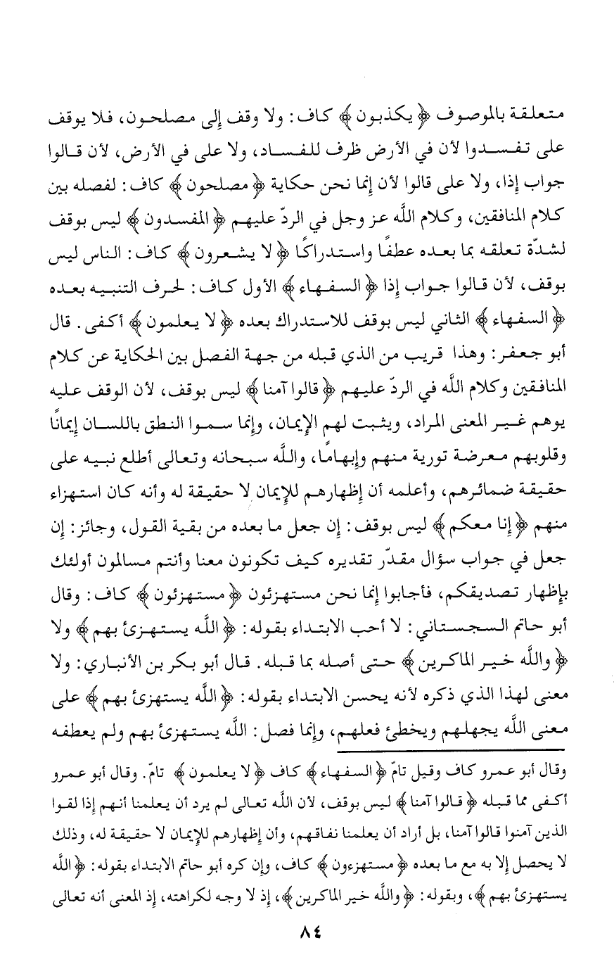 متعلقة بالموصوف يَكْذِبُونَ كاف: ولا وقف إلى مصلحون، فلا يوقف على تفسدوا لأن في الأرض ظرف للفساد، ولا على في الأرض، لأن قالوا جواب إذا، ولا على قالوا لأن إنما نحن حكاية مُصْلِحُونَ كاف: لفصله بين كلام المنافقين، وكلام الله عز وجل في الردّ عليهم الْمُفْسِدُونَ ليس بوقف لشدّة تعلقه بما بعده عطفا واستدراكا لا يَشْعُرُونَ كاف: الناس ليس بوقف، لأن قالوا جواب إذا السُّفَهاءُ الأول كاف: لحرف التنبيه بعده السُّفَهاءُ الثاني ليس بوقف للاستدراك بعده لا يَعْلَمُونَ أكفى. قال أبو جعفر: وهذا قريب من الذي قبله من جهة الفصل بين الحكاية عن كلام المنافقين وكلام الله في الردّ عليهم قالُوا آمَنَّا ليس بوقف، لأن الوقف عليه يوهم غير المعنى المراد، ويثبت لهم الإيمان، وإنما سموا النطق باللسان إيمانا وقلوبهم معرضة تورية منهم وإبهاما، والله سبحانه وتعالى أطلع نبيه على حقيقة ضمائرهم، وأعلمه أن إظهارهم للإيمان لا حقيقة له وأنه كان استهزاء منهم إِنَّا مَعَكُمْ ليس بوقف: إن جعل ما بعده من بقية القول، وجائز: إن جعل في جواب سؤال مقدّر تقديره كيف تكونون معنا وأنتم مسالمون أولئك بإظهار تصديقكم، فأجابوا إنما نحن مستهزءون مُسْتَهْزِؤُنَ كاف: وقال أبو حاتم السجستاني: لا أحب الابتداء بقوله: اللَّهُ يَسْتَهْزِئُ بِهِمْ ولا وَاللَّهُ خَيْرُ الْماكِرِينَ* حتى أصله بما قبله. قال أبو بكر بن الأنباري: ولا معنى لهذا الذي ذكره لأنه يحسن الابتداء بقوله: اللَّهُ يَسْتَهْزِئُ بِهِمْ على معنى الله يجهلهم ويخطئ فعلهم، وإنما فصل: الله يستهزئ بهم ولم يعطفه