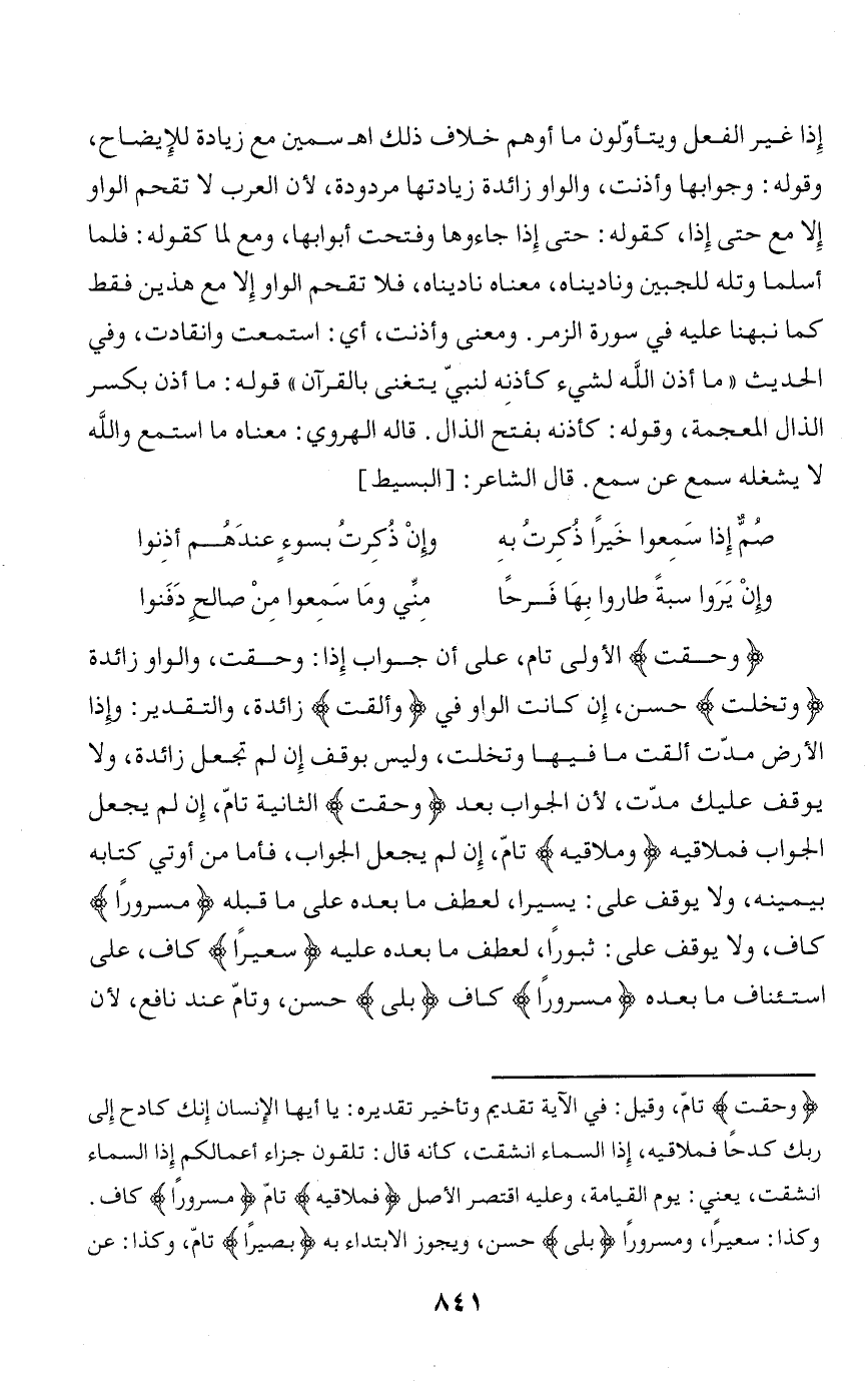 وَحُقَّتْ الأولى تام، على أن جواب إذا: وحقت، والواو زائدة وَتَخَلَّتْ حسن، إن كانت الواو في وَأَلْقَتْ زائدة، والتقدير: وإذا الأرض مدّت ألقت ما فيها وتخلت، وليس بوقف إن لم تجعل زائدة، ولا يوقف عليك مدّت، لأن الجواب بعد وَحُقَّتْ الثانية تامّ، إن لم يجعل الجواب فَمُلاقِيهِ و (ملاقيه) تامّ، إن لم يجعل الجواب، فأما من أوتي كتابه بيمينه، ولا يوقف على: يسيرا، لعطف ما بعده على ما قبله مَسْرُوراً كاف، ولا يوقف على: ثبورا، لعطف ما بعده عليه سَعِيراً كاف، على استئناف ما بعده مَسْرُوراً كاف بَلى حسن، وتامّ عند نافع، لأن