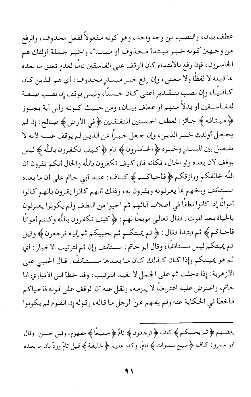 يجعل أولئك خبر الذين، وإن جعل خبرا عن الذين لم يوقف عليه لأنه لا يفصل بين المبتدإ وخبره الْخاسِرُونَ تام كَيْفَ تَكْفُرُونَ بِاللَّهِ ليس بوقف لأن بعده واو الحال، فكأنه قال كيف تكفرون بالله والحال أنكم تقرون أن الله خالقكم ورازقكم فَأَحْياكُمْ كاف: عند أبي حاتم على أن ما بعده مستأنف وبخهم بما يعرفونه ويقرون به، وذلك أنهم كانوا يقرون بأنهم كانوا أمواتا إذا كانوا نطفا في أصلاب آبائهم ثم أحيوا من النطف ولم يكونوا يعترفون بالحياة بعد الموت. فقال تعالى موبخا لهم: كَيْفَ تَكْفُرُونَ بِاللَّهِ وَكُنْتُمْ أَمْواتاً فَأَحْياكُمْ ثم ابتدأ فقال: ثُمَّ يُمِيتُكُمْ ثُمَّ يُحْيِيكُمْ ثُمَّ إِلَيْهِ تُرْجَعُونَ وقيل ثم يميتكم ليس مستأنفا، وقال أبو حاتم: مستأنف وإن ثم لترتيب الأخبار: أي ثم هو يميتكم وإذا كان كذلك كان ما بعدها مستأنفا. قال الحلبي على الأزهرية: إذا دخلت ثم على الجمل لا تفيد الترتيب، وقد خطأ ابن الأنباري أبا حاتم، واعترض عليه اعتراضا لا يلزمه، ونقل عنه أن الوقف على قوله فأحياكم فأخطأ في الحكاية عنه ولم يفهم عن الرجل ما قاله، وقوله إن القوم لم يكونوا