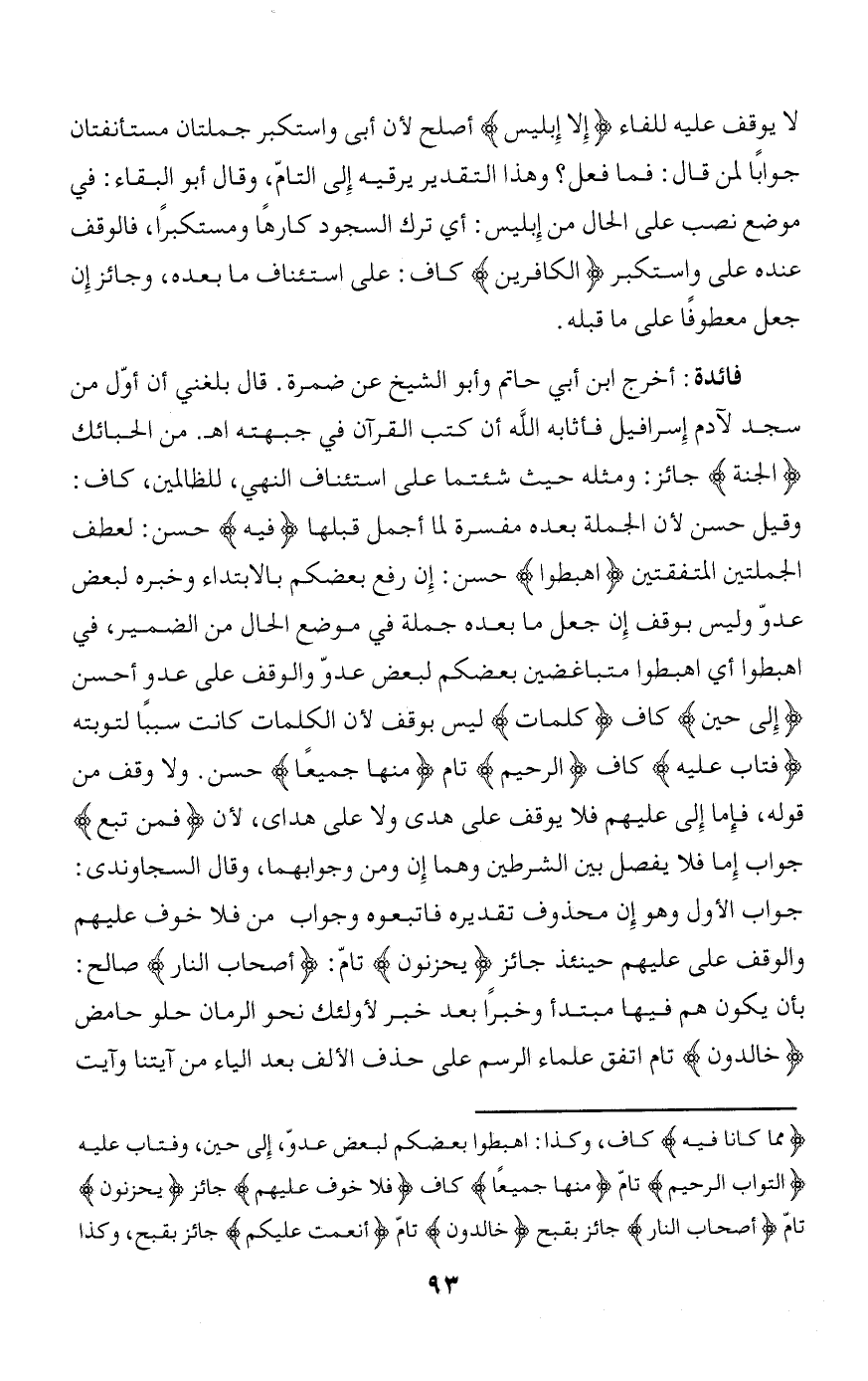 وقيل حسن لأن الجملة بعده مفسرة لما أجمل قبلها فِيهِ حسن: لعطف الجملتين المتفقتين اهْبِطُوا حسن: إن رفع بعضكم بالابتداء وخبره لبعض عدوّ وليس بوقف إن جعل ما بعده جملة في موضع الحال من الضمير، في اهبطوا أي اهبطوا متباغضين بعضكم لبعض عدوّ والوقف على عدو أحسن إِلى حِينٍ كاف كَلِماتٍ ليس بوقف لأن الكلمات كانت سببا لتوبته فَتابَ عَلَيْهِ كاف الرَّحِيمُ تام مِنْها جَمِيعاً حسن. ولا وقف من قوله، فإما إلى عليهم فلا يوقف على هدى ولا على هداى، لأن فَمَنْ تَبِعَ جواب إما فلا يفصل بين الشرطين وهما إن ومن وجوابهما، وقال السجاوندى: