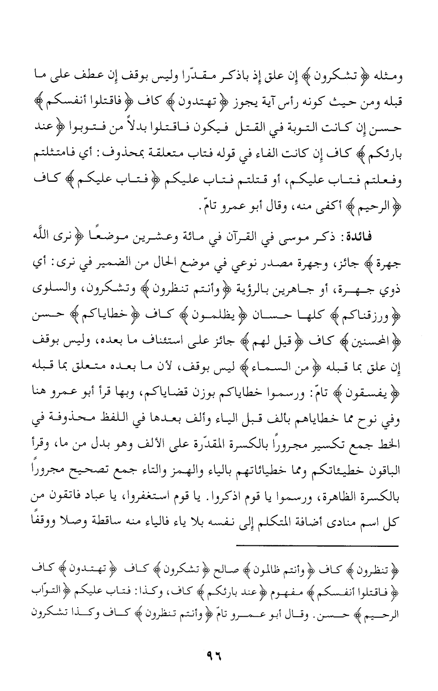 فائدة: ذكر موسى في القرآن في مائة وعشرين موضعا نَرَى اللَّهَ جَهْرَةً جائز، وجهرة مصدر نوعي في موضع الحال من الضمير في نرى: أي ذوي جهرة، أو جاهرين بالرؤية وَأَنْتُمْ تَنْظُرُونَ وتشكرون، والسلوى ورَزَقْناكُمْ كلها حسان يَظْلِمُونَ كاف خَطاياكُمْ حسن الْمُحْسِنِينَ كاف قِيلَ لَهُمْ جائز على استئناف ما بعده، وليس بوقف إن علق بما قبله مِنَ السَّماءِ ليس بوقف، لأن ما بعده متعلق بما قبله يَفْسُقُونَ تامّ: ورسموا خطاياكم بوزن قضاياكم، وبها قرأ أبو عمرو هنا وفي نوح مما خطاياهم بألف قبل الياء وألف بعدها في اللفظ محذوفة في الخط جمع تكسير مجرورا بالكسرة المقدّرة على الألف وهو بدل من ما، وقرأ الباقون خطيئاتكم ومما خطيائاتهم بالياء والهمز والتاء جمع تصحيح مجرورا بالكسرة الظاهرة، ورسموا يا قوم اذكروا. يا قوم استغفروا، يا عباد فاتقون من كل اسم منادى إضافة المتكلم إلى نفسه بلا ياء فالياء منه ساقطة وصلا ووقفا