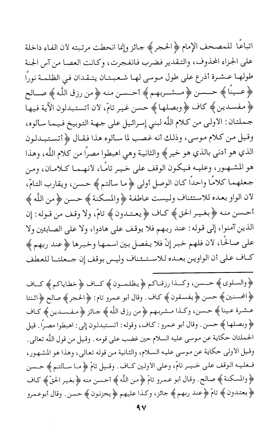 أذرع على طول موسى لها شعبتان يتقدان في الظلمة نورا عَيْناً حسن مَشْرَبَهُمْ أحسن منه مِنْ رِزْقِ اللَّهِ صالح مُفْسِدِينَ كاف وَبَصَلِها حسن غير تامّ، لأن أتستبدلون الآية فيها جملتان: الأولى من كلام الله لبني إسرائيل على جهة التوبيخ فيما سألوه، وقيل من كلام موسى، وذلك أنه غصب لما سألوه هذا فقال أَتَسْتَبْدِلُونَ الَّذِي هُوَ أَدْنى بِالَّذِي هُوَ خَيْرٌ والثانية وهي اهبطوا مصرا من كلام الله، وهذا هو المشهور، وعليه فيكون الوقف على خير تاما، لأنهما كلامان، ومن جعلهما كلاما واحدا كان الوصل أولى ما سَأَلْتُمْ حسن، ويقارب التامّ، لأن الواو بعده للاستئناف وليست عاطفة وَالْمَسْكَنَةُ حسن مِنَ اللَّهِ أحسن منه بِغَيْرِ الْحَقِّ كاف يَعْتَدُونَ تامّ، ولا وقف من قوله: إن الذين آمنوا، إلى قوله: عند ربهم فلا يوقف على هادوا، ولا على الصابئين ولا على صالحا، لأن فلهم خبر إنّ فلا يفصل بين اسمها وخبرها عِنْدَ رَبِّهِمْ كاف على أن الواوين بعده للاستئناف وليس بوقف إن جعلتا للعطف