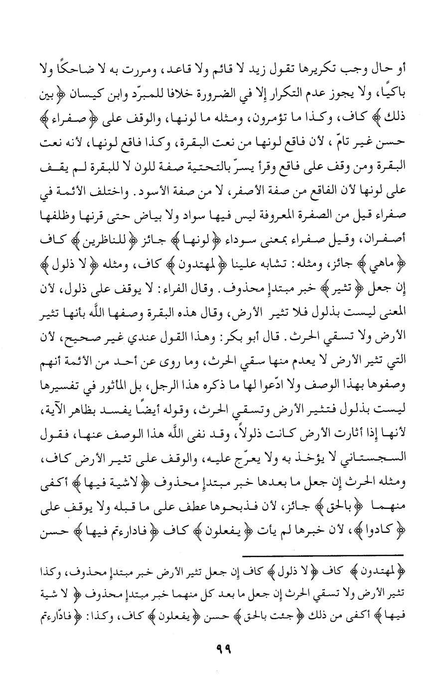 أو حال وجب تكريرها تقول زيد لا قائم ولا قاعد، ومررت به لا ضاحكا ولا باكيا، ولا يجوز عدم التكرار إلا في الضرورة خلافا للمبرّد وابن كيسان بَيْنَ ذلِكَ كاف، وكذا ما تؤمرون، ومثله ما لونها، والوقف على صَفْراءُ حسن غير تامّ، لأن فاقع لونها من نعت البقرة، وكذا فاقع لونها، لأنه نعت البقرة ومن وقف على فاقع وقرأ يسرّ بالتحتية صفة للون لا للبقرة لم يقف على لونها لأن الفاقع من صفة الأصفر، لا من صفة الأسود. واختلف الأئمة في صفراء قيل من الصفرة المعروفة ليس فيها سواد ولا بياض حتى قرنها وظلفها أصفران، وقيل صفراء بمعنى سوداء لَوْنُها جائز النَّاظِرِينَ كاف ما هِيَ جائز، ومثله: تشابه علينا لَمُهْتَدُونَ كاف، ومثله لا ذَلُولٌ إن جعل تُثِيرُ خبر مبتدإ محذوف. وقال الفراء: لا يوقف على ذلول، لأن المعنى ليست بذلول فلا تثير الأرض، وقال هذه البقرة وصفها الله بأنها تثير الأرض ولا تسقي الحرث. قال أبو بكر: وهذا القول عندي غير صحيح، لأن التي تثير الأرض لا يعدم منها سقي الحرث، وما روى عن أحد من الأئمة أنهم وصفوها بهذا الوصف ولا ادّعوا لها ما ذكره هذا الرجل، بل المأثور في تفسيرها ليست بذلول فتثير الأرض وتسقي الحرث، وقوله أيضا يفسد بظاهر الآية، لأنها إذا أثارت الأرض كانت ذلولا، وقد نفى الله هذا الوصف عنها، فقول السجستاني لا يؤخذ به ولا يعرّج عليه، والوقف على تثير الأرض كاف، ومثله الحرث إن جعل ما بعدها خبر مبتدإ محذوف لا شِيَةَ فِيها أكفى منهما بِالْحَقِّ جائز، لأن فذبحوها عطف على ما قبله ولا يوقف على كادُوا، لأن خبرها لم يأت يَفْعَلُونَ كاف فَادَّارَأْتُمْ فِيها حسن