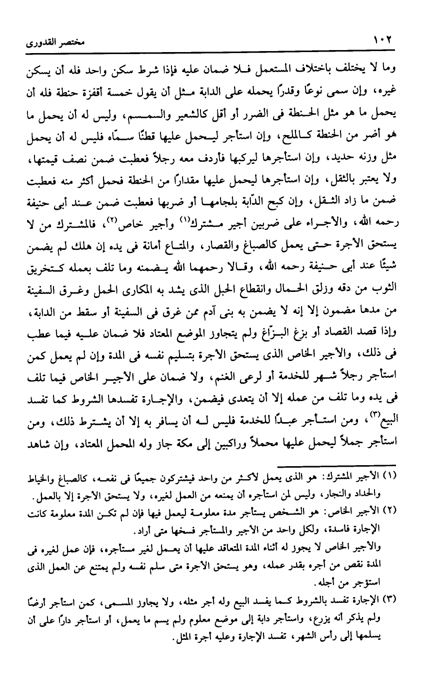 وأجير مشترك وأجير خاص فالمشترك: من لا يستحق الأجرة حتى يعمل كالصباغ والقصار والمتاع أمانة في يده: إن هلك لم يضمن شيئا عند أبي حنيفة وقال أبو يوسف ومحمد: يضمنه وما تلف بعمله كتخريق الثوب من دقة وزلق الحمال وانقطاع الحبل الذي يشد به المكاري الحمل وغرق السفينة من مدها مضمون إلا أنه لا يضمن به بني آدم فمن غرق في السفينة أو سقط من الدابة ثم يضمنه وإذا قصد الفصاد أو بزغ البزاغ ولم يتجاوز الموضع المعتاد فلا ضمان عليه فيما عطب من ذلك