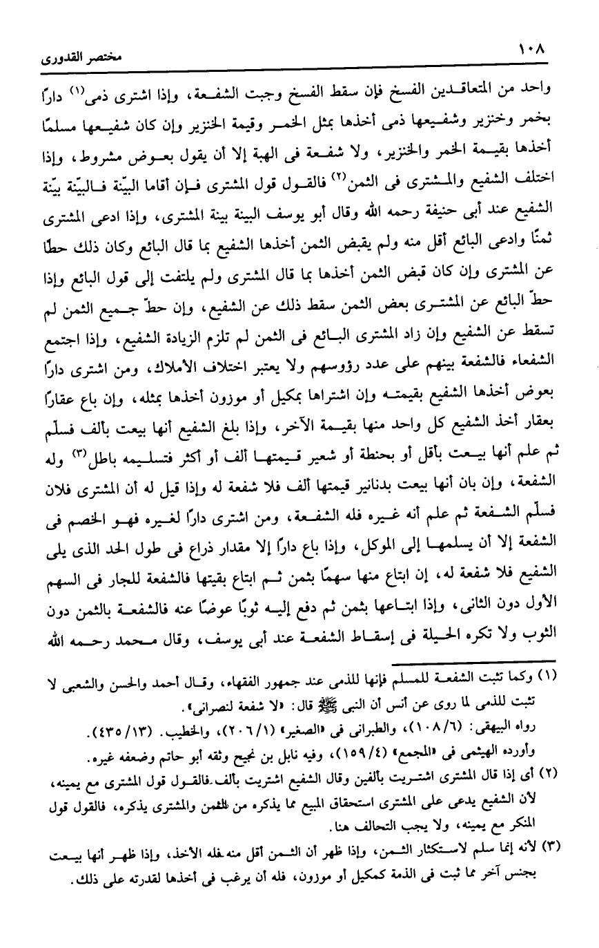 وإذا اشترى ذمي دارا بخمر أو خنزير وشفيعها ذمي أخذها بمثل الخمر وقيمة الخنزير وإن كان شفيعها مسلما أخذها بقمة الخمر والخنزير