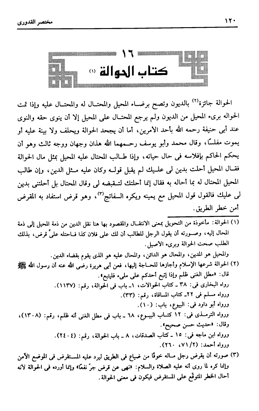 الحوالة: جائزة بالديون وتصح برضا المحيل والمحتال له والمحال عليه وإذا تمت الحوالة برىء المحيل من الدين ولم يرجع المحتال على المحيل إلاأن يتوى حقه والتوى عند أبي حنيفة أحد أمرين: إما أن يجحد الحوالة ويحلف ولا بينة عليه أو يموت مفلسا وقال أبو يوسف ومحمد هاذان ووجه ثالث وهو أن يحكم الحاكم بإفلاسه في حال حياته