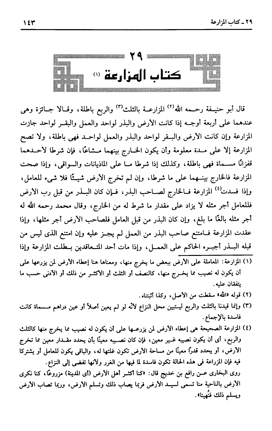 قال أبو حنيفة رحمه الله: المزارعة بالثلث والربع باطلة وقال أبو يوسف ومحمد: جائزة