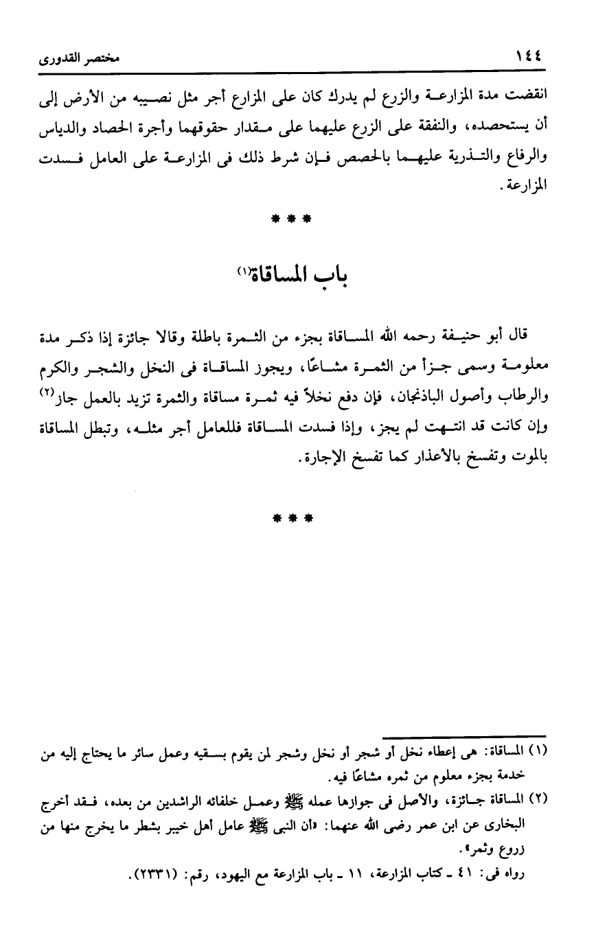 قال أبو حنيفة: المسافاة بجزء من الثمرة باطلة وقال أبو يوسف ومحمد: جائزة إذا ذكرا مدة معلومة وسميا جزاءا من الثمرة مشاعا