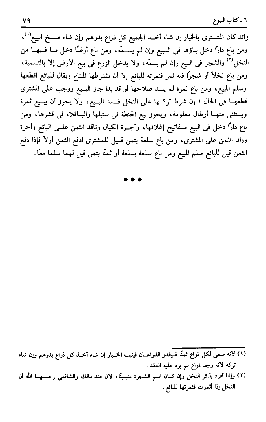 ومن باع أرضا دخل ما فيها وإن لم يسمه ولا يدخل الزرع في بيع الأرض إلا بالتسمية ومن باع نخلا أو شجرا فيه ثمر فثمرته للبائع إلا أن يشترطها المبتاع ويقال للبائع: اقطعها وسلم المبيع ومن باع ثمرة لم يبد صلاحها أو قد بدا جاز البيع ووجب على المشتري قطعها في الحال فإن شرط تركها على النخل فسد البيع
