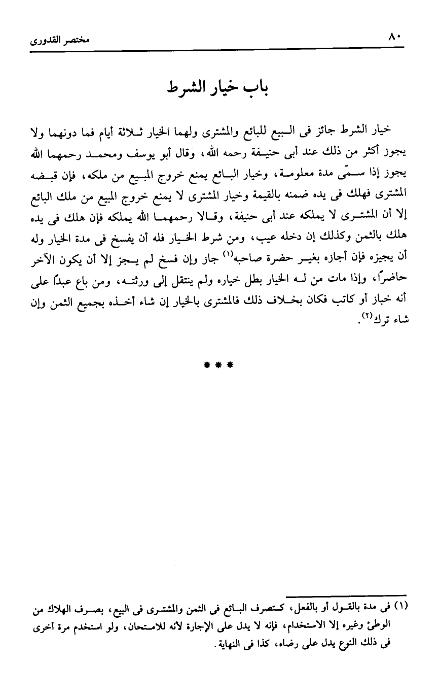خيار الشرط: جائز في البيع للبائع والمشتري ولهما الخيار ثلاثة أيام فما دونها ولا يجوز أكثر من ذلك عند أبي حنيفة رحمه الله وقال أبو يوسف ومحمد رحمهما الله: يجوز إذا سمى مدة معلومة