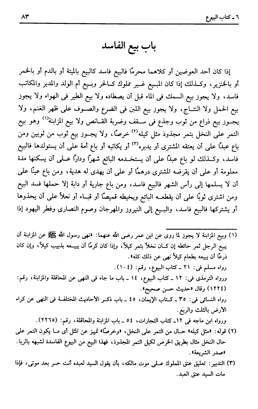 إذا كان أحد العوضين أو كلاهما محرما فالبيع فاسد كالبيع بالميتة أو بالدم أو بالخمر أو بالخنزير وكذلك إذا كان غير مملوك كالحر وبيع أم الولد والمدبر والمكاتب فاسد ولا يجوز بيع السمك في الماء ولا بيع الطير في الهواء ولا يجوز بيع الحمل ولا النتاج ولا بيع اللبن في الضرع والصرف على ظهر الغنم وذراع من ثوب وجذع في سقف وضربة القانص وبيع المزابنة - وهو بيع الثمر على رؤوس النخل بخرصه تمرا - ولا يجوز البيع بإلقاء الحجر والملامسة