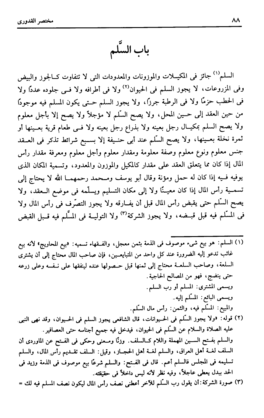 السلم جائز في المكيلات والموزونات والمعدودات التي لا تتفاوت كالجوز والبيض وفي المذروعات ولا يجوز السلم في الحيوان ولا في أطرافه ولا في الجلود عددا ولا في الحطب حزما ولا في الرطبة جرزا