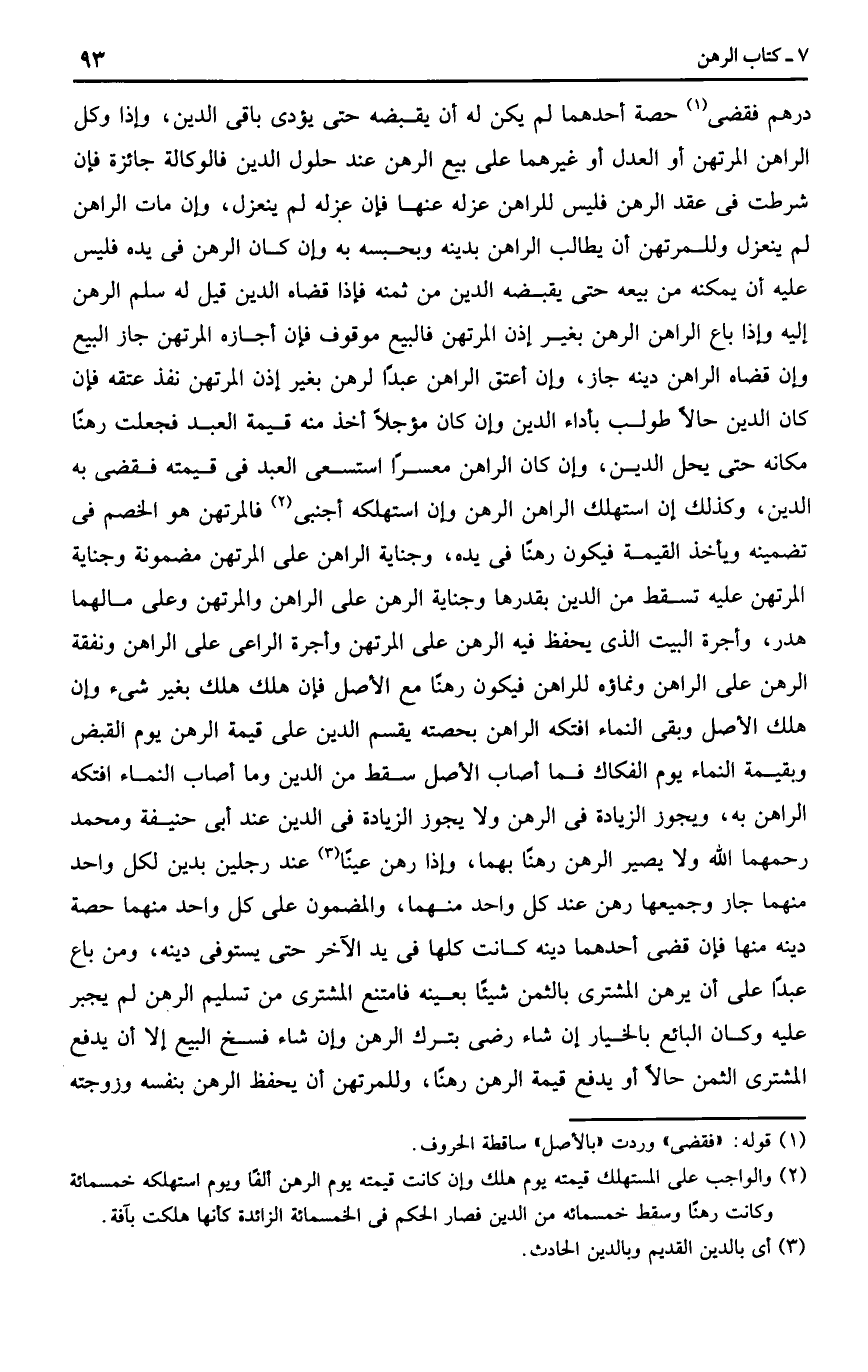 وكذلك إذا استهلك الراهن الرهن وإن استهلكه أجنبي فالمرتهن هو الخصم في تضمينه ويأخذ القيمة فتكون رهنا في يده وجناية الراهن على الرهن مضمونة وجناية المرتهن عليه تسقط من دينه بقدرها وجناية الرهن على الراهن وعلى المرتهن وعلى مالهما هدر