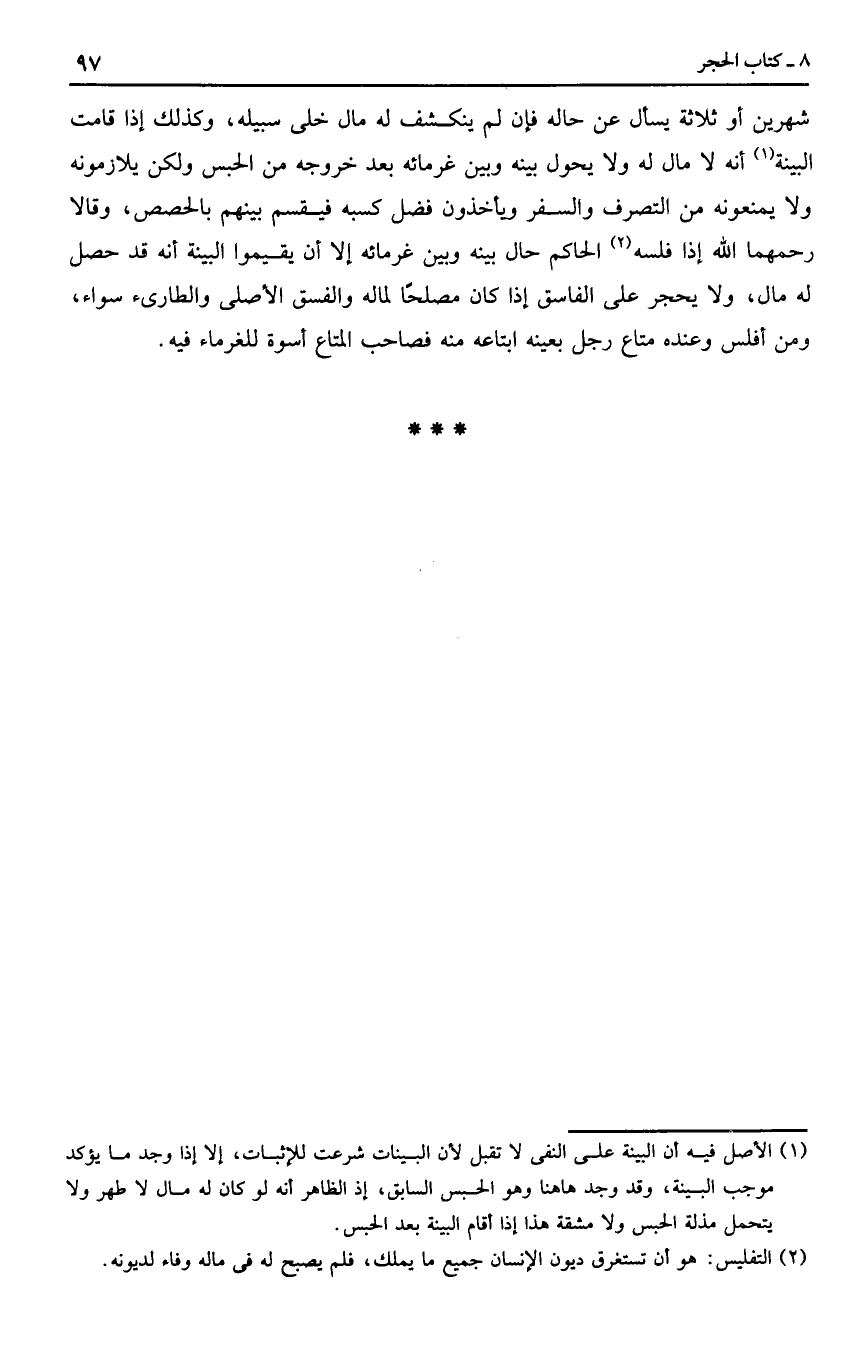 وقال أبو يوسف ومحمد: إذا فلسه الحاكم حال بينه وبين غرمائه إلا أن يقيموا البينه أنه قد حصل له مال
