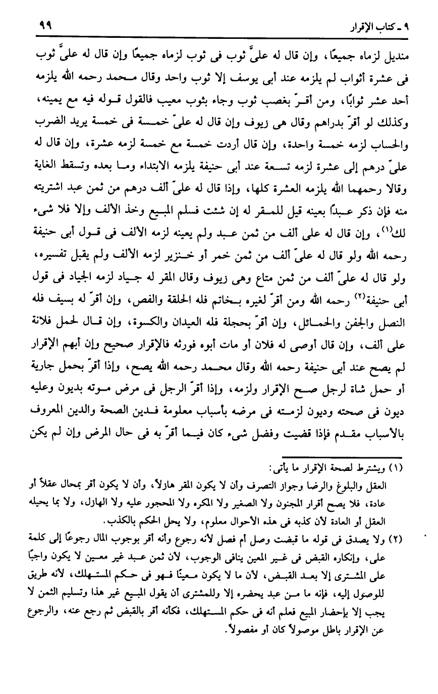 وإذا أقر بحمل جارية أو حمل شاة لرجل صح الإقرار ولزمه وإذا أقر الرجل في مرض موتته بديون وعليه ديون في صحته وديون لزمته في مرضه بأسباب معلومة فدين الصحة والدين المعروف بالأسباب مقدم على غيره فإذا قضيت شيء