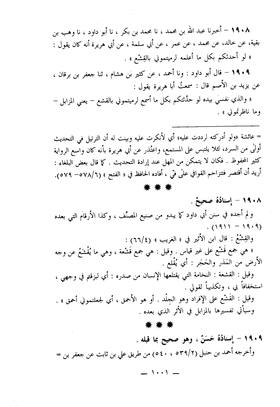 1909 - قَالَ أَبُو دَاوُدَ: وَنا أَحْمَدُ، عَنْ كَثِيرِ بْنِ هِشَامٍ، ثنا جَعْفَرُ بْنُ بُرْقَانَ، عَنْ يَزِيدَ بْنِ الْأَصَمِّ قَالَ: سَمِعْتُ أَبَا هُرَيْرَةَ يَقُولُ: «وَالَّذِي نَفْسِي بِيَدِهِ §لَوْ حَدَّثْتُكُمْ بِكُلِّ مَا أَسْمَعُ لَرَمَيْتُمُونِي بِالْقِشْعِ، يَعْنِي الْمَزَابِلَ، وَمَا نَاظَرْتُمُونِي»