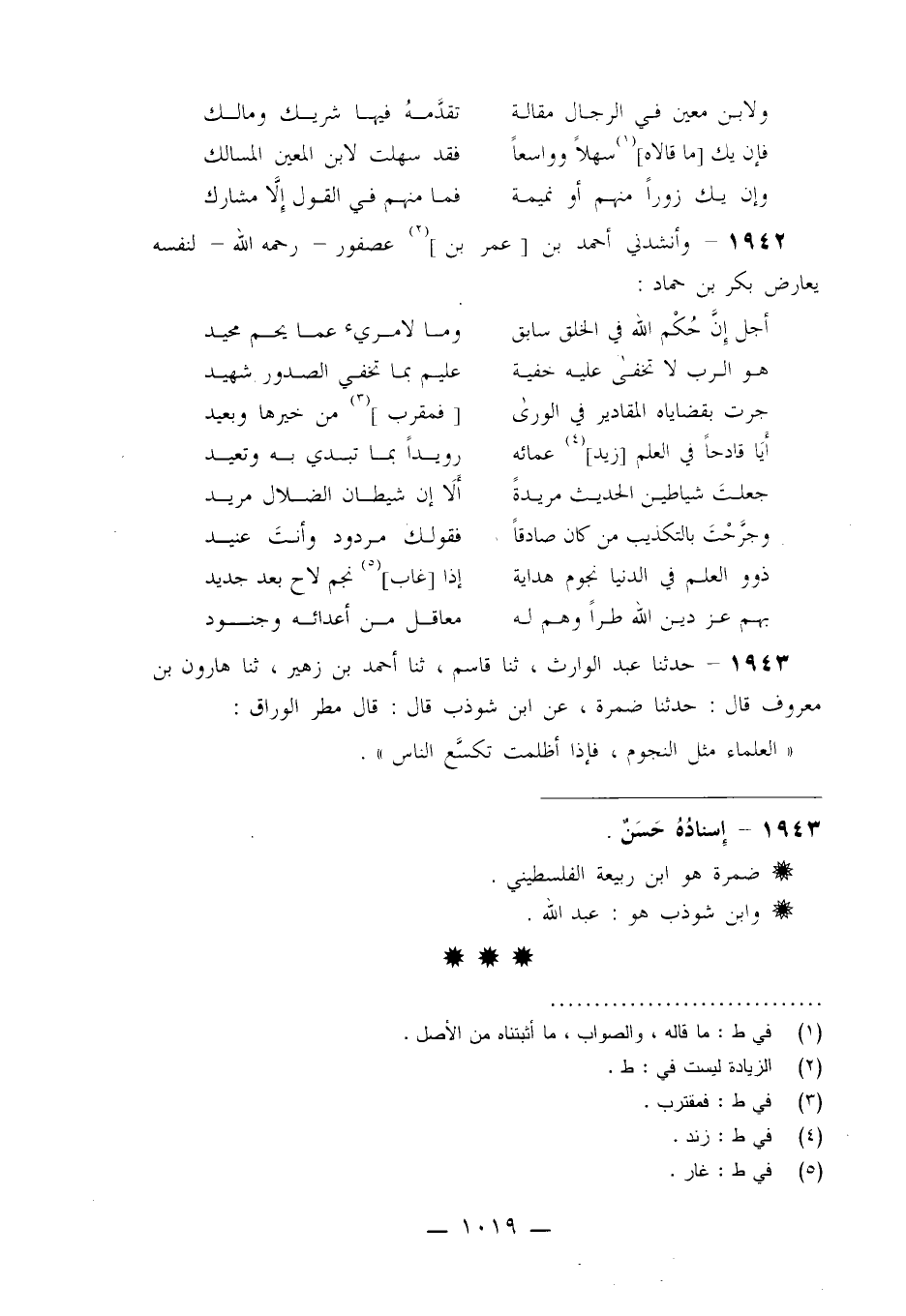 1943 - حَدَّثَنَا عَبْدُ الْوَارِثِ، ثنا قَاسِمٌ، ثنا أَحْمَدُ بْنُ زُهَيْرٍ، ثنا هَارُونُ بْنُ مَعْرُوفٍ، قَالَ: حَدَّثَنَا ضَمْرَةُ، عَنِ ابْنِ شَوْذَبٍ، قَالَ: قَالَ مَطَرٌ الْوَرَّاقُ، §«الْعُلَمَاءُ مِثْلُ النُّجُومِ فَإِذَا أَظْلَمَتْ تَكَسَّعَ النَّاسُ»