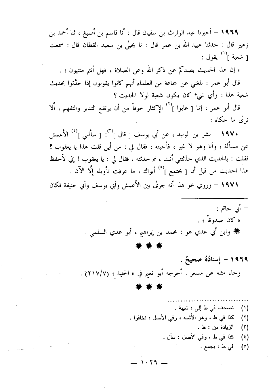 1969 - أَخْبَرَنَا عَبْدُ الْوَارِثِ بْنُ سُفْيَانَ قَالَ: أَنَا قَاسِمُ بْنُ أَصْبَغَ، ثنا أَحْمَدُ بْنُ زُهَيْرٍ قَالَ: حَدَّثَنَا عُبَيْدُ اللَّهِ بْنُ عُمَرَ قَال: نا يَحْيَى بْنُ سَعِيدٍ الْقَطَّانُ قَالَ: سَمِعْتُ شُعْبَةَ يَقُولُ: «إِنَّ §هَذَا الْحَدِيثَ يَصُدُّكُمْ عَنْ ذِكْرِ اللَّهِ وَعَنِ الصَّلَاةِ، فَهَلْ أَنْتُمْ مُنْتَهُونَ» ، قَالَ أَبُو عُمَرَ: بَلَغَنِي عَنْ جَمَاعَةٍ مِنَ الْعُلَمَاءِ أَنَّهُمْ كَانُوا يَقُولُونَ إِذَا حُدِّثُوا بِحدِيثِ شُعْبَةَ هَذَا: وَأَيُّ شَيْءٍ كَانَ يَكُونُ شُعْبَةُ لَوْلَا الْحَدِيثُ؟، قَالَ أَبُو عُمَرَ: إِنَّمَا عَابُوا الْإِكْثَارَ خَوْفًا مِنْ أَنْ يَرْتَفِعَ التَّدَبُّرُ وَالتَّفَهُّمُ، أَلَا تَرَى مَا حَكَاهُ