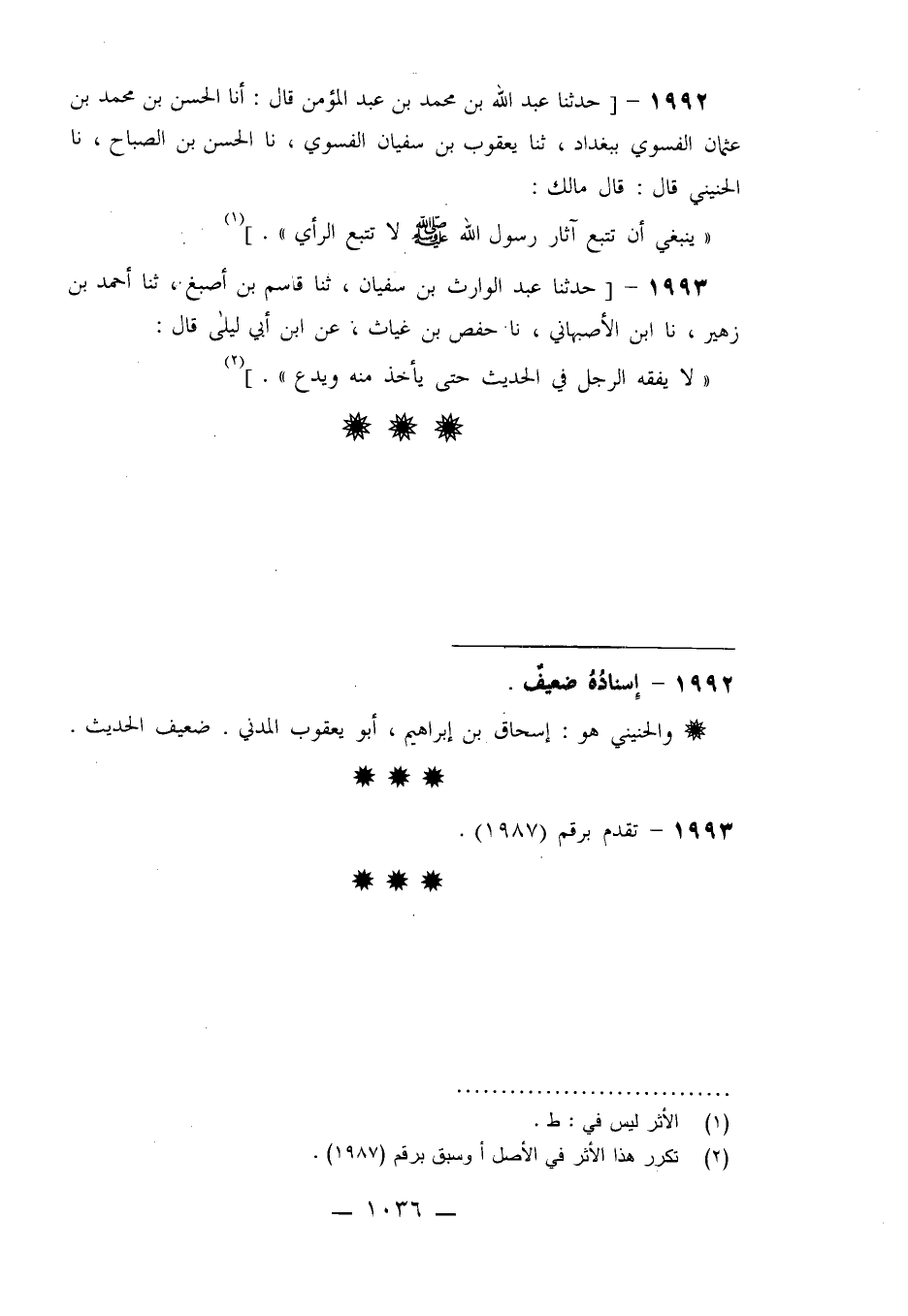 1992 - حَدَّثَنَا عَبْدُ اللَّهِ بْنُ مُحَمَّدِ بْنِ عَبْدِ الْمُؤْمِنِ، قَالَ: أنا الْحَسَنُ بْنُ مُحَمَّدِ بْنِ عُثْمَانَ الْفَسَوِيُّ بِبَغْدَادَ، ثنا يَعْقُوبُ بْنُ سُفْيَانَ الْفَسَوِيُّ نا الْحَسَنُ بْنُ الصَّبَّاحِ نا الْحُنَيْنِيُّ قَالَ: قَالَ مَالِكٌ: §«يَنْبَغِي أَنْ تَتَّبِعَ آثَارَ رَسُولِ اللَّهِ صَلَّى اللَّهُ عَلَيْهِ وَسَلَّمَ، لَا تَتَّبِعِ الرَّأْيَ»