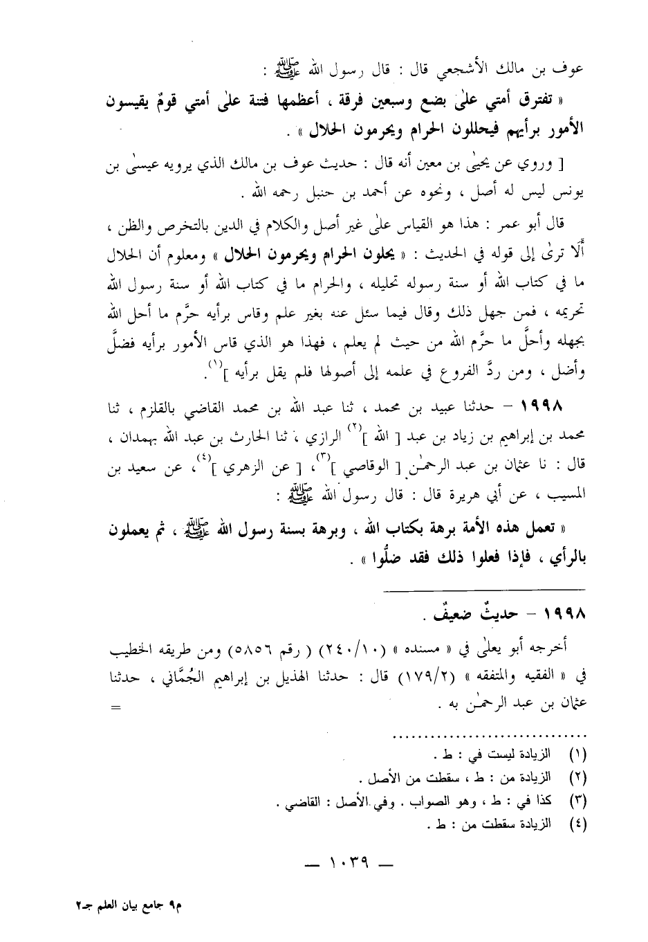 1998 - حَدَّثَنَا عُبَيْدُ بْنُ مُحَمَّدٍ، ثنا عَبْدُ اللَّهِ بْنُ مُحَمَّدٍ الْقَاضِي، بِالْقُلْزُمِ، ثنا مُحَمَّدُ بْنُ إِبْرَاهِيمَ بْنِ زِيَادِ بْنِ عَبْدِ اللَّهِ الرَّازِيُّ، ثنا الْحَارِثُ بْنُ عَبْدِ اللَّهِ، بِهَمْدَانَ قَالَ: نا عُثْمَانُ بْنُ عَبْدِ الرَّحْمَنِ الْوَقَّاصِيُّ، عَنِ الزُّهْرِيِّ عَنْ سَعِيدِ بْنِ الْمُسَيِّبِ، عَنْ أَبِي هُرَيْرَةَ، قَالَ: قَالَ رَسُولُ اللَّهِ صَلَّى اللَّهُ عَلَيْهِ وَسَلَّمَ: §«تَعْمَلُ هَذِهِ الْأَمَّةُ بُرْهَةً بِكِتَابِ اللَّهِ وَبُرْهَةً بِسُنَّةِ رَسُولِ اللَّهِ صَلَّى اللَّهُ عَلَيْهِ وَسَلَّمَ ثُمَّ يَعْمَلُونَ بِالرَّأْيِ فَإِذَا فَعَلُوا ذَلِكَ فَقَدْ ضَلُّوا»