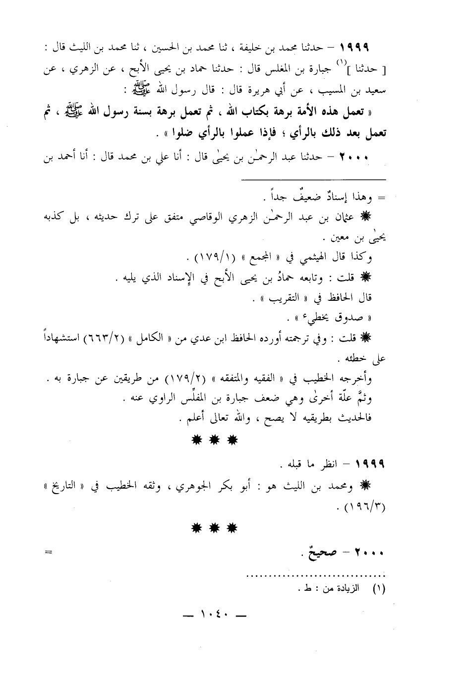 1999 - حَدَّثَنَا مُحَمَّدُ بْنُ خَلِيفَةَ، ثنا مُحَمَّدُ بْنُ الْحُسَيْنِ، ثنا مُحَمَّدُ بْنُ اللَّيْثِ، قَالَ: حَدَّثَنَا جُبَارَةُ بْنُ الْمُغَلِّسِ، قَالَ حَدَّثَنَا حَمَّادُ بْنُ يَحْيَى الْأَبَحُّ، عَنِ الزُهْرِيِّ، عَنْ سَعِيدِ بْنِ الْمُسَيِّبِ، عَنْ أَبِي هُرَيْرَةَ، قَالَ: قَالَ رَسُولُ اللَّهِ صَلَّى اللَّهُ عَلَيْهِ وَسَلَّمَ: §«تَعْمَلُ هَذِهِ الْأَمَّةُ بُرْهَةً بِكِتَابِ اللَّهِ ثُمَّ تَعْمَلُ بُرْهَةً بِسُنَّةِ رَسُولِ اللَّهِ صَلَّى اللَّهُ عَلَيْهِ وَسَلَّمَ ثُمَّ تَعْمَلُ بَعْدَ ذَلِكَ بِالرَّأْيِ فَإِذَا عَمِلُوا بِالرَّأْيِ ضَلُّوا»