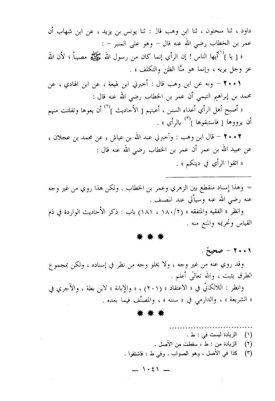 2001 - وَبِهِ عَنِ ابْنِ وَهْبٍ، قَالَ: أَخْبَرَنِي ابْنُ لَهِيعَةَ، عَنِ ابْنِ الْهَادِي، عَنْ مُحَمَّدِ بْنِ إِبْرَاهِيمَ التَّيْمِيِّ، أَنَّ عُمَرَ بْنَ الْخَطَّابِ رَضِيَ اللَّهُ عَنْهُ، قَالَ: §«أَصْبَحَ أَهْلُ الرَّأْيِ أَعْدَاءَ السُّنَنِ أَعْيَتْهُمُ الْأَحَادِيثُ أَنْ يَعُوهَا وَتَفَلَّتَتْ مِنْهُمْ أَنْ يَرْوُوهَا فَاسْتَبَقُوهَا بِالرَّأْيِ»