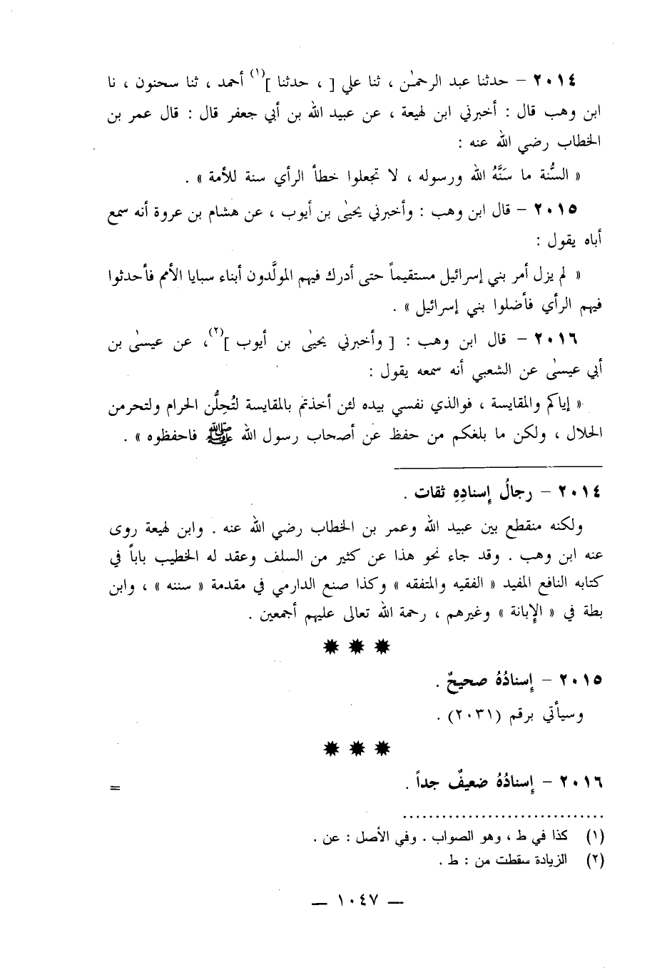 2014 - حَدَّثَنَا عَبْدُ الرَّحْمَنِ، ثنا عَلِيٌّ، حَدَّثَنَا أَحْمَدُ، ثنا سُحْنُونُ، نا ابْنُ وَهْبٍ، قَالَ: أَخْبَرَنِي ابْنُ لَهِيعَةَ، عَنْ عُبَيْدِ اللَّهِ بْنِ أَبِي جَعْفَرٍ، قَالَ: قَالَ عُمَرُ بْنُ الْخَطَّابِ رَضِيَ اللَّهُ عَنْهُ، «§السُّنَّةُ مَا سَنَّهُ اللَّهُ وَرَسُولُهُ، لَا تَجْعَلُوا خَطَأَ الرَّأْيِ سُنَّةً لِلْأُمَّةِ»