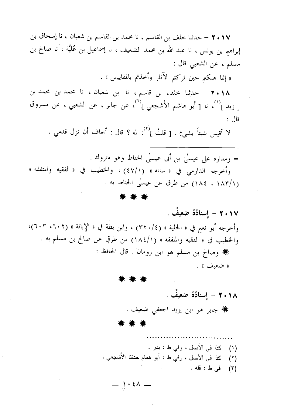 2017 - حَدَّثَنَا خَلَفُ بْنُ الْقَاسِمِ، نا مُحَمَّدُ بْنُ الْقَاسِمِ بْنِ شَعْبَانَ، نا إِسْحَاقُ بْنُ إِبْرَاهِيمَ بْنِ يُونُسَ، نا عَبْدُ اللَّهِ بْنُ مُحَمَّدٍ الضَّعِيفُ، نا إِسْمَاعِيلُ ابْنُ عُلَيَّةَ، نا صَالِحُ بْنُ مُسْلِمٍ، عَنِ الشَّعْبِيِّ، قَالَ: «إِنَّمَا §هَلَكْتُمْ حِينَ تَرَكْتُمُ الْآثَارَ، وَأَخَذْتُمْ بِالْمَقَايِيسِ»