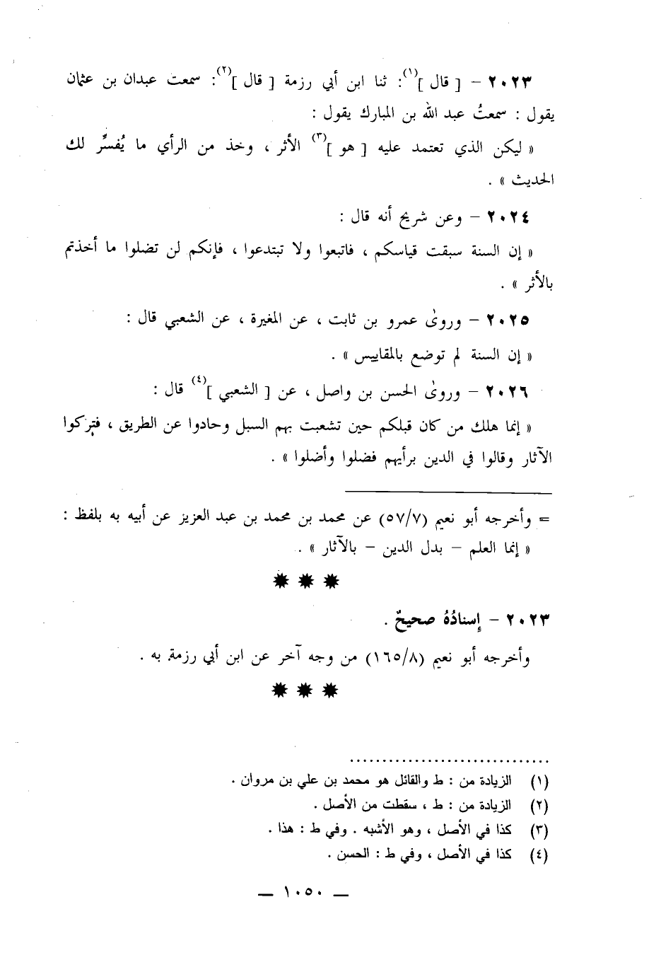 2023 - قَالَ: ثنا ابْنُ أَبِي رِزْمَةَ، قَالَ: سَمِعْتُ عَبْدَانَ بْنَ عُثْمَانَ، يَقُولُ: سَمِعْتُ عَبْدَ اللَّهِ بْنَ الْمُبَارَكِ، يَقُولُ: §«لِيَكُنِ الَّذِي تَعْتَمِدُ عَلَيْهِ هُوَ الْأَثرُ وَخُذْ مِنَ الرَّأْيِ مَا يُفَسِّرُ لَكَ الْحَدِيثَ»