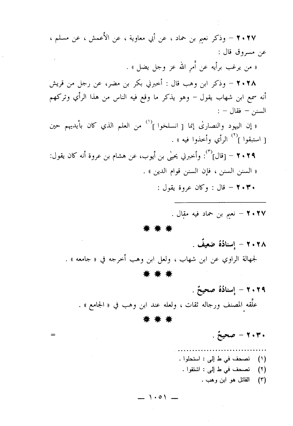 2028 - وَذَكَرَ ابْنُ وَهْبٍ، قَالَ: أَخْبَرَنِي بَكْرُ بْنُ مُضَرَ، عَنْ رَجُلٍ، مِنْ قُرَيْشٍ أَنَّهُ سَمِعَ ابْنَ شِهَابٍ، يَقُولُ وَهُوَ يَذْكُرُ مَا وَقَعَ فِيهِ النَّاسُ مِنْ هَذَا الرَّأْيِ وَتَرْكَهُمُ السُّنَنَ فَقَالَ: «إِنَّ §الْيَهُودَ وَالنَّصَارَى إِنَّمَا انْسَلَخُوا مِنَ الْعِلْمِ الَّذِي كَانَ بِأَيْدِيهِمْ حِينَ اسْتَبَقُوا الرَّأْيَ وَأَخَذُوا فِيهِ»