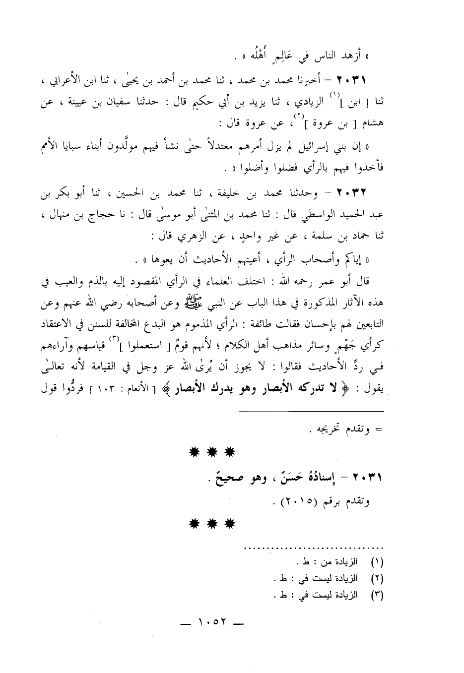 2032 - وَحَدَّثَنَا مُحَمَّدُ بْنُ خَلِيفَةَ، ثنا مُحَمَّدُ بْنُ الْحُسَيْنِ، ثنا أَبُو بَكْرِ بْنُ عَبْدِ الْحَمِيدِ الْوَاسِطِيُّ، قَالَ: ثنا مُحَمَّدُ بْنُ الْمُثَنَّى أَبُو مُوسَى، قَالَ: نا حَجَّاجُ بْنُ مِنْهَالٍ، ثنا حَمَّادُ بْنُ سَلَمَةَ، عَنْ غَيْرِ وَاحِدٍ، عَنِ الزُّهْرِيِّ، قَالَ: §«إِيَّاكُمْ وَأَصْحَابَ الرَّأْيِ؛ أَعْيَتْهُمُ الْأَحَادِيثُ أَنْ يَعُوهَا» قَالَ أَبُو عُمَرَ رَحِمَهُ اللَّهُ: " اخْتَلَفَ الْعُلَمَاءُ فِي الرَّأْيِ الْمَقْصُودِ إِلَيْهِ بِالذَّمِّ وَالْعَيْبِ فِي هَذِهِ الْآثَارِ الْمَذْكُورَةِ فِي هَذَا الْبَابِ عَنِ النَّبِيِّ صَلَّى اللَّهُ عَلَيْهِ وَسَلَّمَ وَعَنْ أَصْحَابِهِ رَضِيَ اللَّهُ عَنْهُمْ، وَعَنِ التَّابِعِينَ لَهُمْ بِإِحْسَانٍ فَقَالَتْ طَائِفَةٌ: الرَّأْيُ الْمَذْمُومُ هُوَ الْبِدَعُ الْمُخَالِفَةُ لِلسُّنَنِ فِي الِاعْتِقَادِ كَرَأْيِ جَهْمٍ وَسَائِرِ مَذَاهِبِ أَهْلِ الْكَلَامِ؛ لِأَنَّهُمْ قَوْمٌ اسْتَعْمَلُوا قِيَاسَهُمْ وَآرَاءَهُمْ فِي رَدِّ الْأَحَادِيثِ فَقَالُوا: لَا يَجُوزُ أَنْ يُرَى اللَّهُ عَزَّ وَجَلَّ فِي الْقِيَامَةِ؛ لِأَنَّهُ تَعَالَى يَقُولُ: {لَا تُدْرِكُهُ الْأَبْصَارُ وَهُوَ يُدْرِكُ الْأَبْصَارَ} [الأنعام: 103] فَرَدُّوا قَوْلَ -[1053]- رَسُولِ اللَّهِ صَلَّى اللَّهُ عَلَيْهِ وَسَلَّمَ: