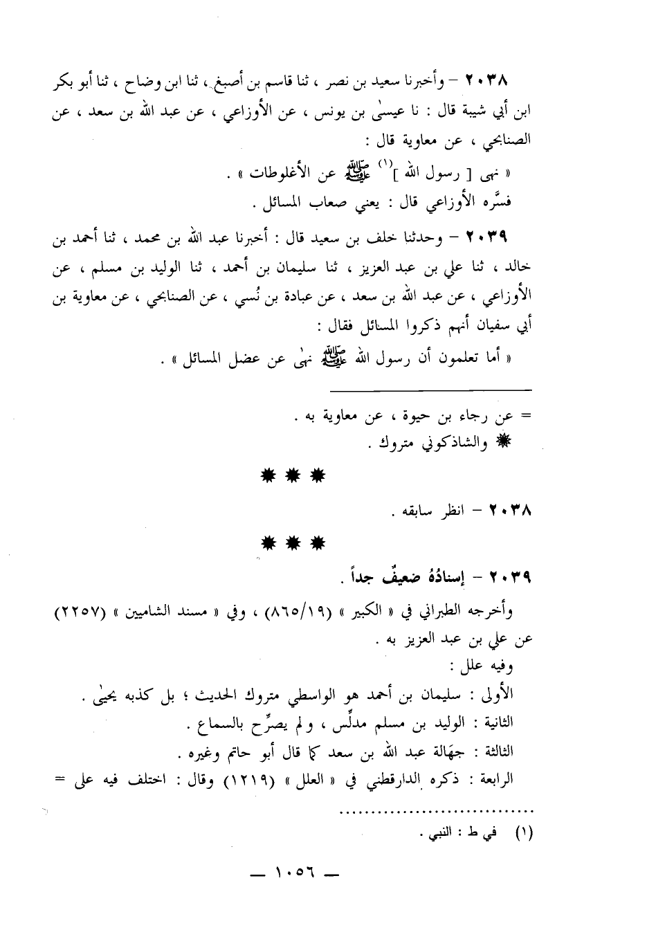 2038 - وَأَخْبَرَنَا سَعِيدُ بْنُ نَصْرٍ، ثنا قَاسِمُ بْنُ أَصْبَغَ، ثنا ابْنُ وَضَّاحٍ، ثنا أَبُو بَكْرِ بْنُ أَبِي شَيْبَةَ، قَالَ: نا عِيسَى بْنُ يُونُسَ، عَنِ الْأَوْزَاعِيِّ، عَنْ عَبْدِ اللَّهِ بْنِ سَعْدٍ، عَنِ الصُّنَابِحِيِّ، عَنْ مُعَاوِيَةَ قَالَ: §«نَهَى رَسُولُ اللَّهِ صَلَّى اللَّهُ عَلَيْهِ وَسَلَّمَ عَنِ الْأُغْلُوطَاتِ» فَسَّرَهُ الْأَوْزَاعِيُّ قَالَ: يَعْنِي صِعَابَ الْمَسَائِلِ